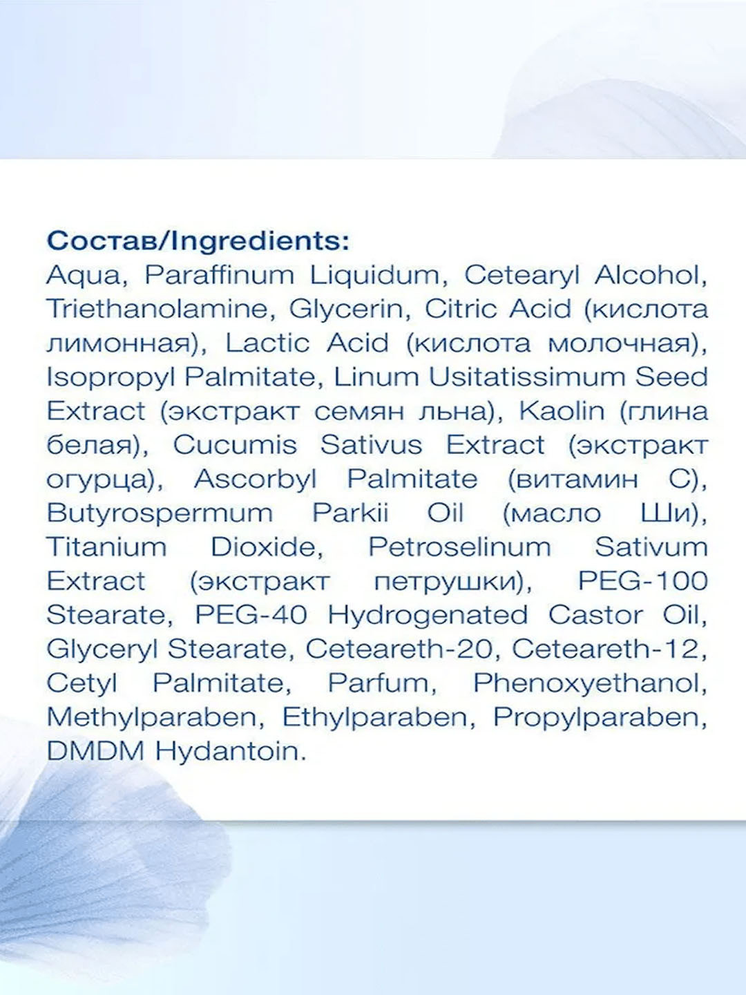 Вода питьевая, пропиленгликоль, масло соевое, масло кокосовое, масло парфюмерное, воск эмульсионный, спирт цетеариловый, кислота молочная, кислота лимонная, стеарат ПЭГ-8, триэтаноламин, полиэтиленовый порошок, каолин, экстракт семян льна, экстракт зеленого чая, экстракт апельсина, экстракт толокнянки, аскорбилпальмитат, коллагеназа, метилхлороизотиазолинон, метилизотиазолинон, микрокар ПМ3, парфюмерная композиция, кислота гиалуроновая, бензилсалицилат, гераниол, гексилциннамал, гидроксицитронеллаль.