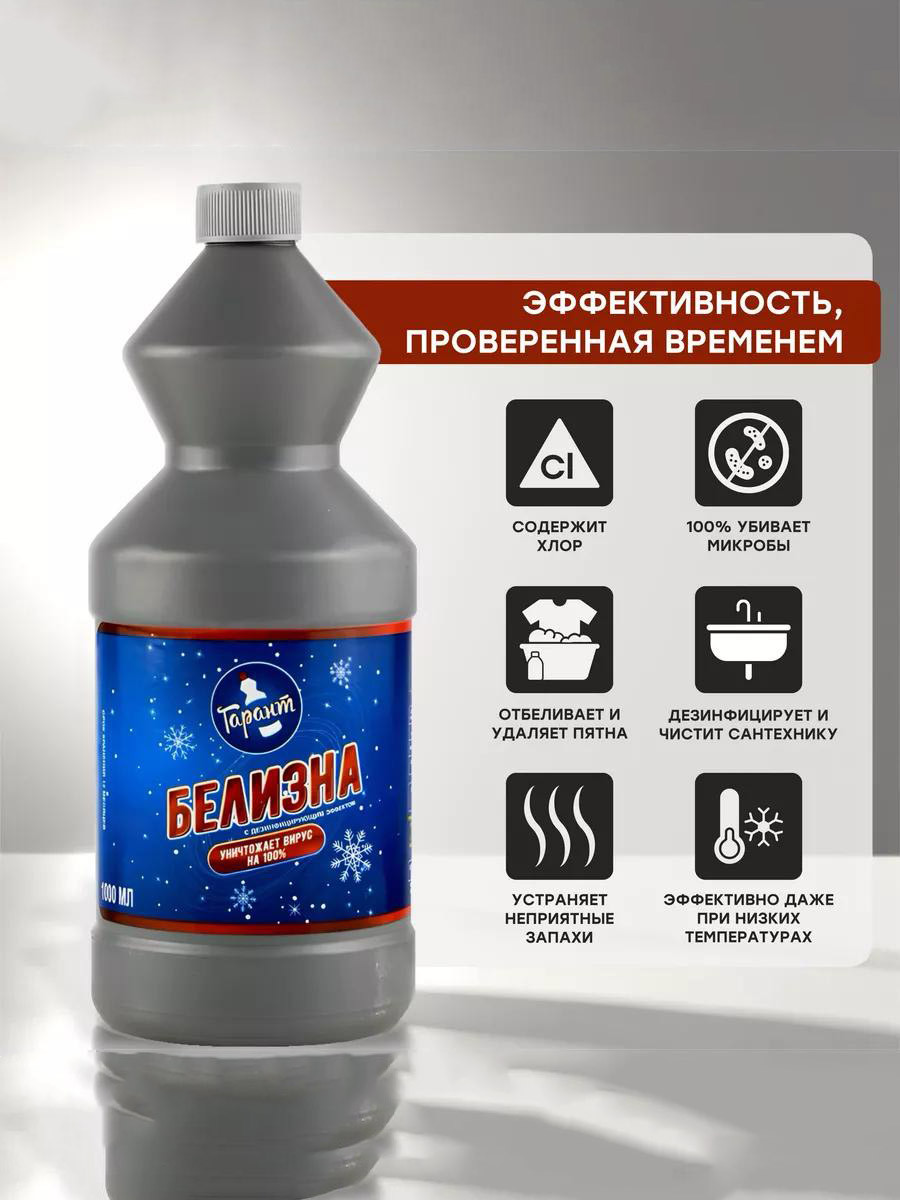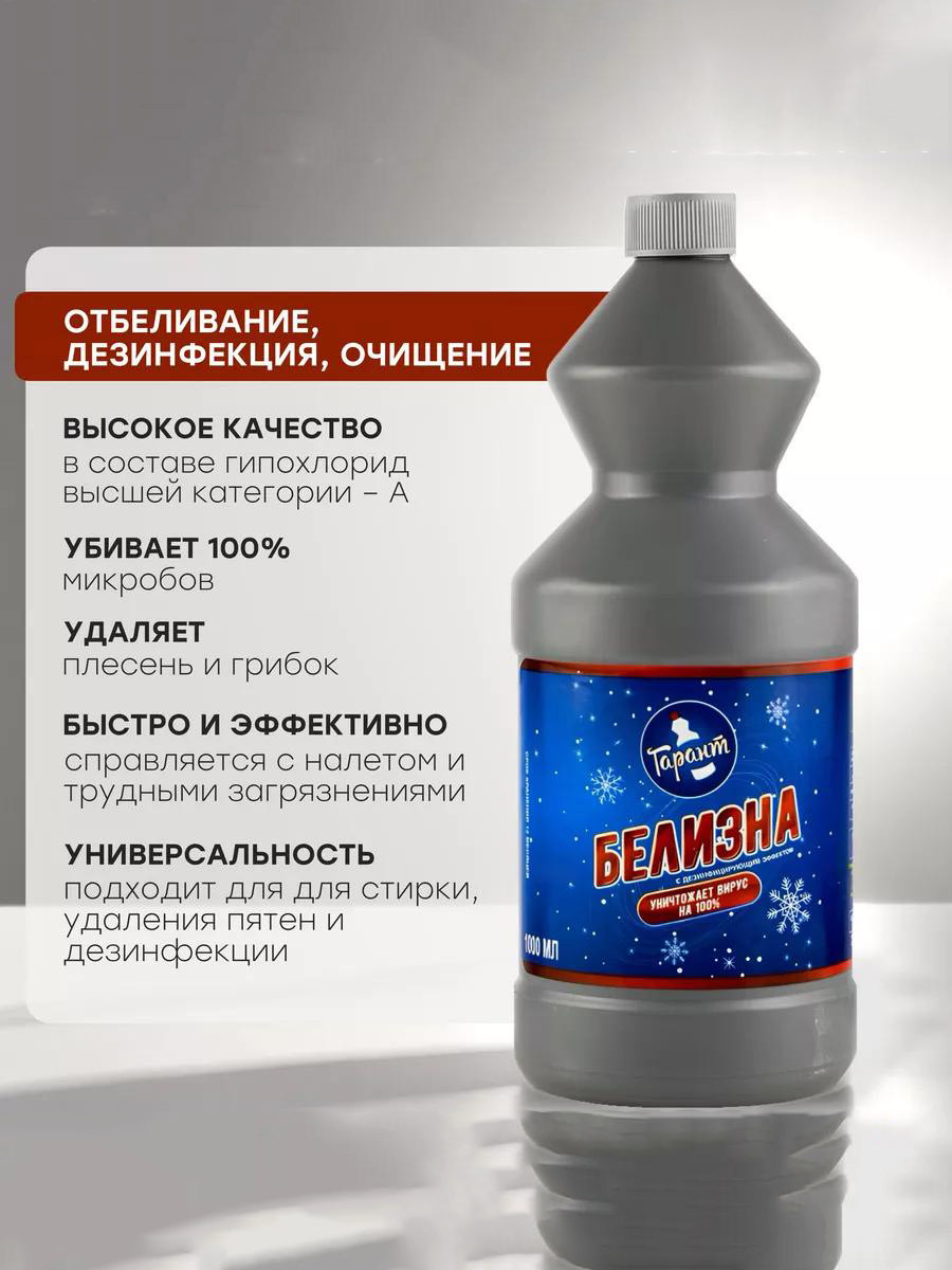 «Белизна» — многофункциональное чистящее и дезинфицирующее средство на основе гипохлорита натрия. Подходит для отбеливания тканей, удаления стойких загрязнений, уничтожения микробов, плесени и грибка. Идеально справляется с дезинфекцией ванных комнат, сантехники, кухонных поверхностей и полов.