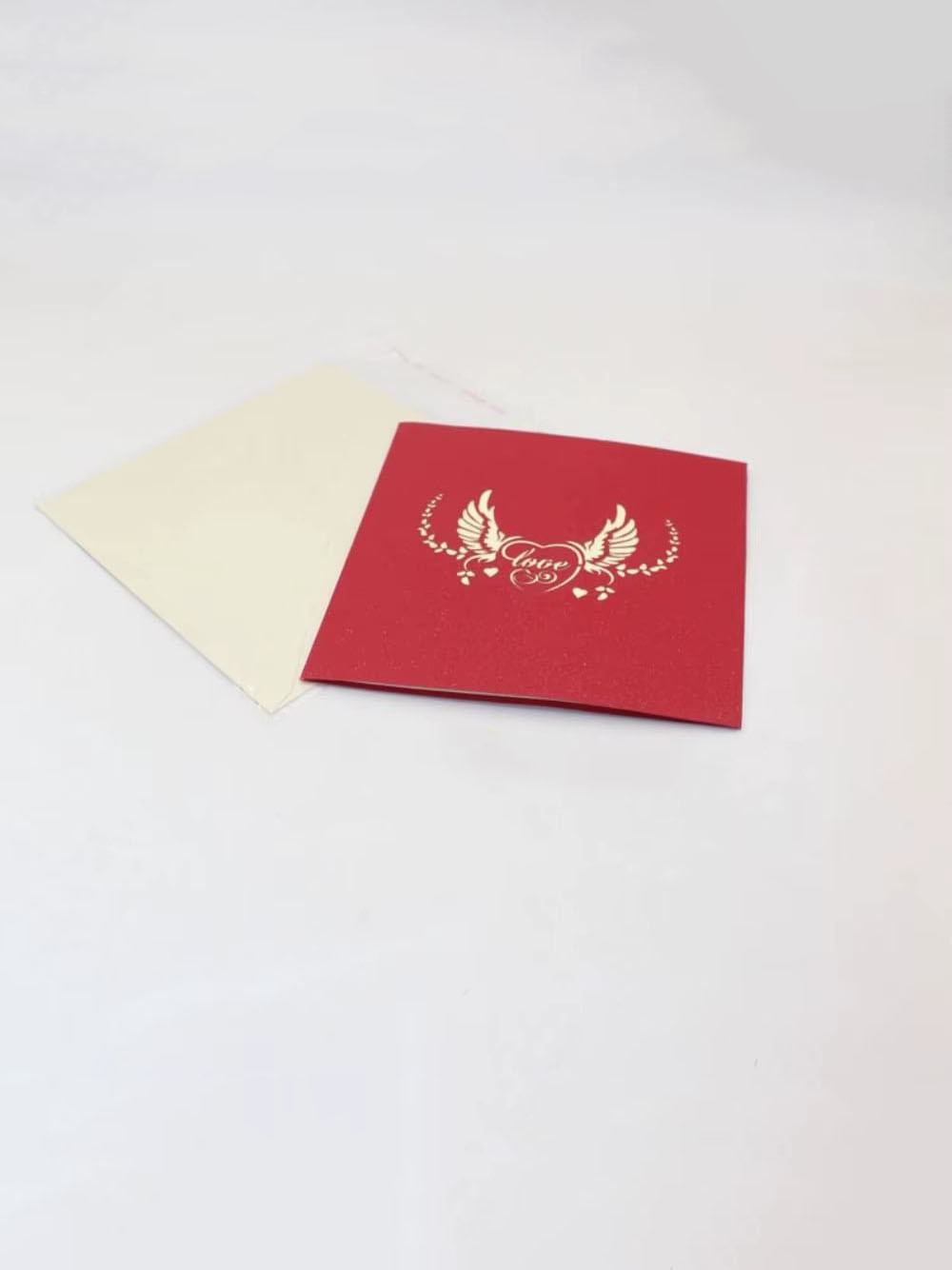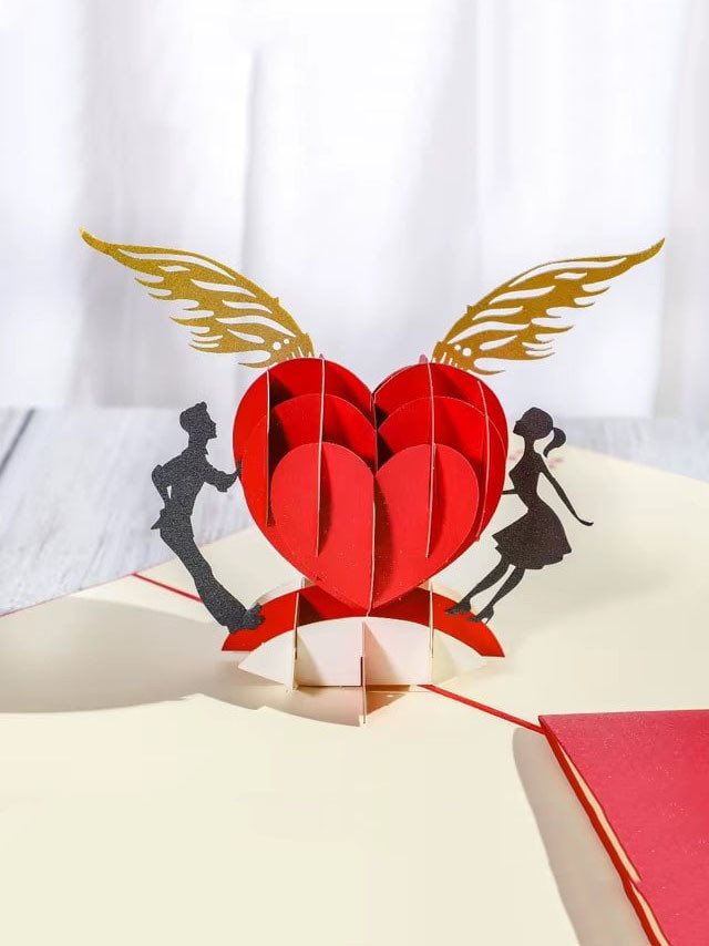 Эта 3D-открытка с объемным крылатым сердцем и силуэтами влюбленных – символ нежности, страсти и вечной любви. При открытии она превращается в красивую композицию, создавая эффект удивления и радости.
