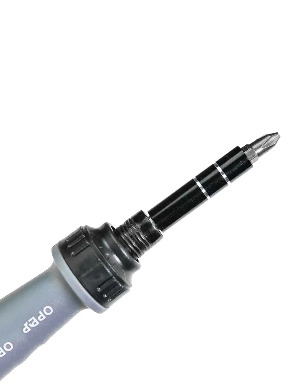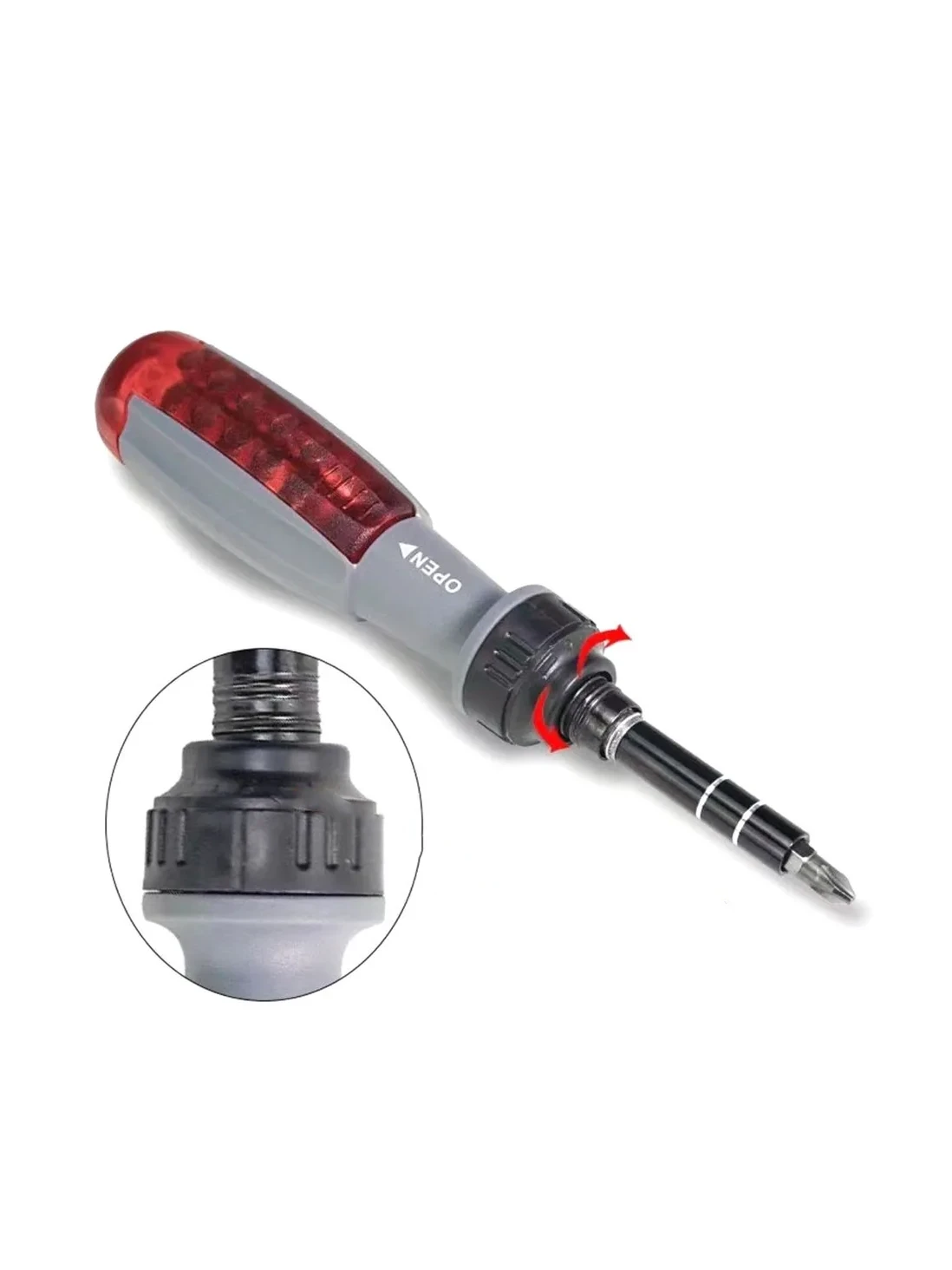 Практичная и многофункциональная отвертка с удобным храповым механизмом, значительно облегчающим работу и ускоряющим процесс закручивания и откручивания винтов. Рукоятка имеет эргономичную форму с прорезиненной поверхностью, обеспечивающей комфортный и надёжный хват. Внутри рукоятки предусмотрен отсек для хранения сменных насадок-бит, позволяющий всегда иметь под рукой нужный инструмент.