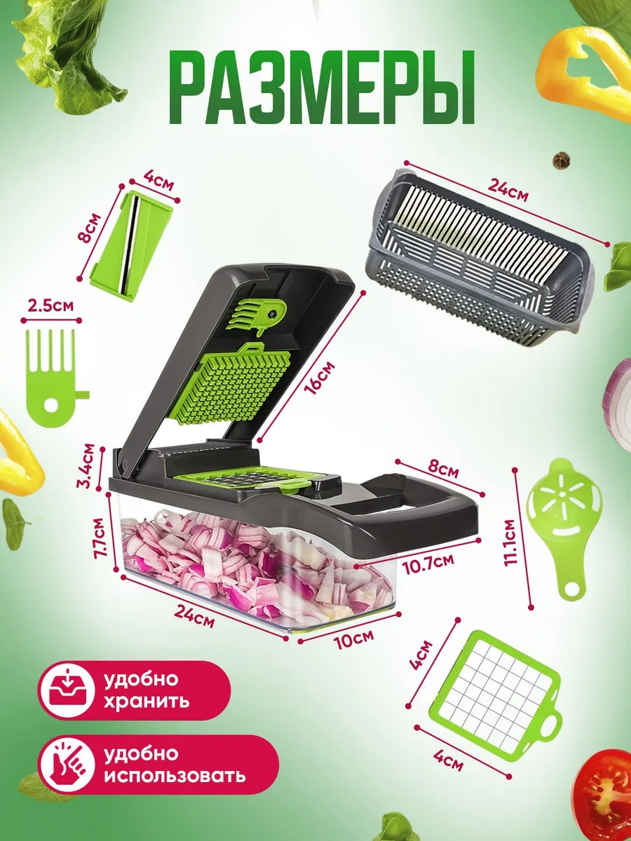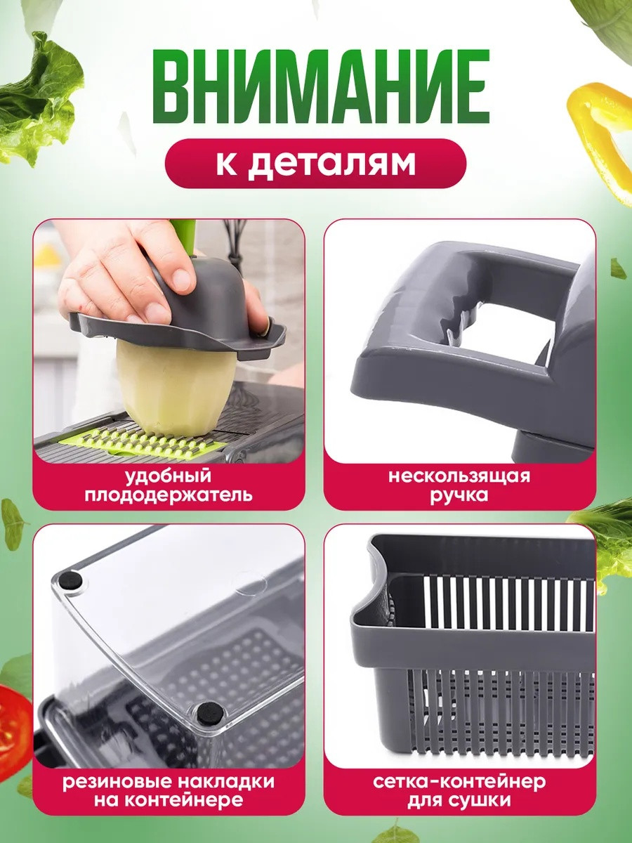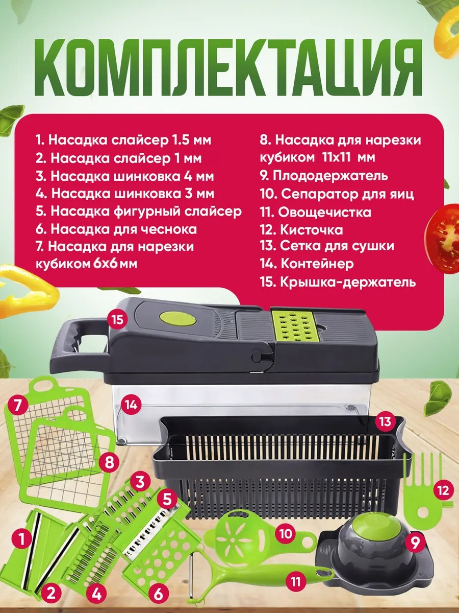 Овощерезка ручная 14в1 - это лучшее приспособление для кухни! Отличный подарок на 8 марта. Товар с гарантией! Наша терка для овощей имеет в комплекте 7 видов сменных насадок разной толщины, для шинковки, держатель овощей и фруктов, разделитель желтка от белка, сеточка для нарезки, контейнер для хранения овощей, который оснащен резиновыми накладками, чтобы не скользить по поверхности. В подарок идет овощечистка! Для защиты ваших рук, фигурный слайсер разработан с держателем, который сохранит ваши пальцы в безопасности. Наша кухонная терка с контейнером выполнена из высококачественного ABS пластика. Хранение на кухне - одно из преимуществ компактных габаритов. Многофункциональная капусторезка молния выполняет большое количество функций и может служить заменой для таких предметов, как винегретница ; ломтерезка, мультирезка, овощерезка кубиками , нож и овощи чистилка; шинковка для капусты , измельчитель лука, измельчители и соковыжималки , мультислайсер и слайсер универсальный. Также она сможет заменить вам такой инвентарь для кухни, как терка для корейской моркови (моркови по корейски), электрическая капуста резка, картофелерезка и фрукторезка. Такой кухонный набор красивой посуды можно взять с собой для пикника и отдыха на природе. Овощерезка с контейнером шинкует овощи и фрукты разными способами и при этом ничего вокруг не пачкается. Механическая терка, намного лучше чем овощерезка электрическая потому что не требует лишних затрат. В нашем наборе мясорубка для овощей и посуда (контейнер) - все в одном! Измельчитель ручной имеет в комплекте специальную вилку для удаления застрявших кусочков еды в прессе. Хорошо подходит, как подарок (подарочный набор) женщине, маме, бабушке, коллеге и теще. В каждом наборе имеется гарантийный талон с данными для обращения по всем вопросам. Успейте купить по доступной цене пока длится период акций и скидок.