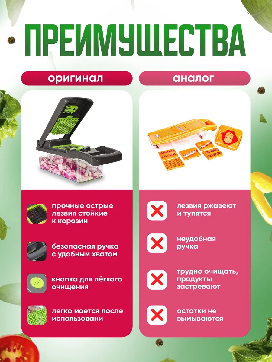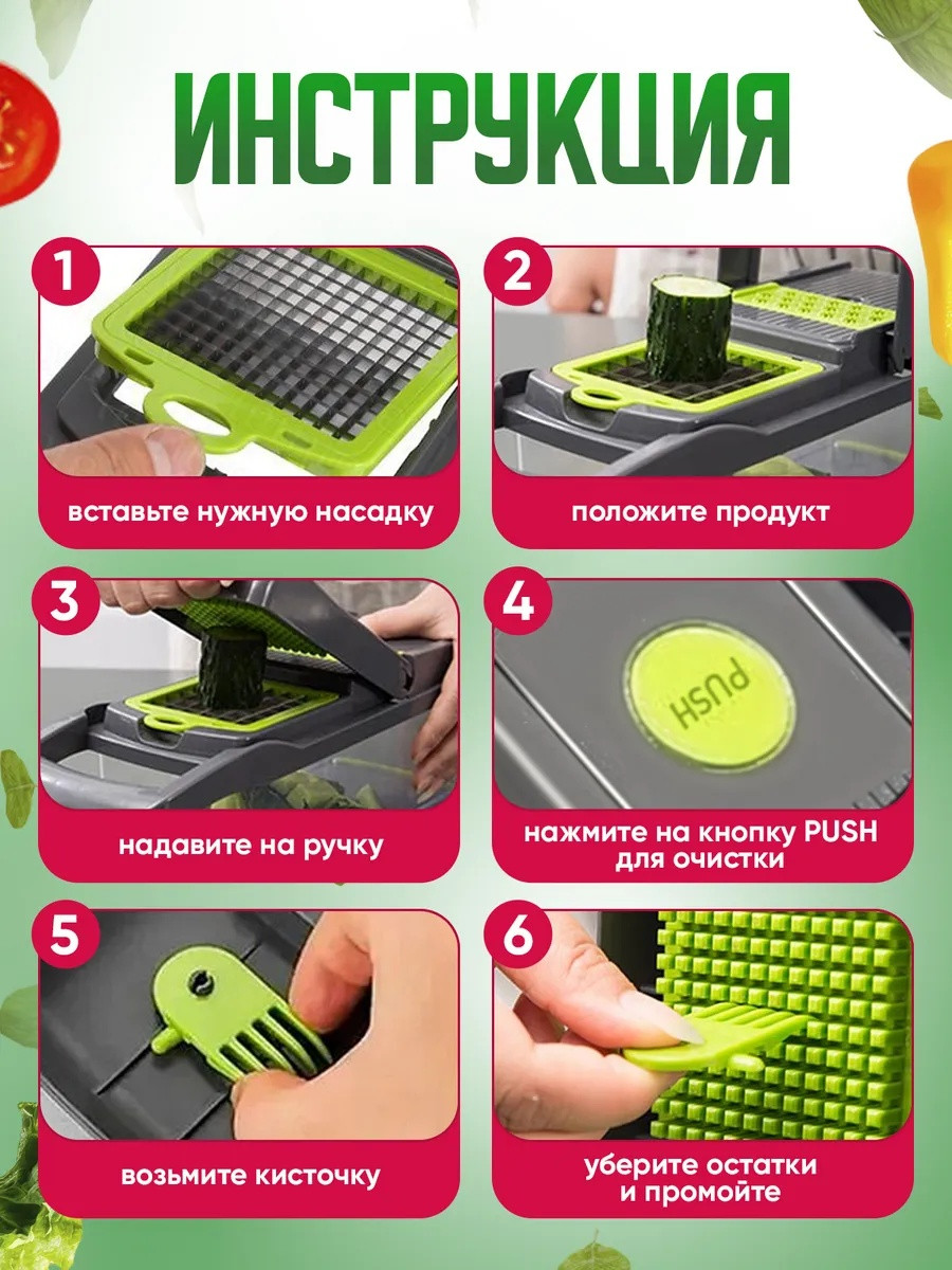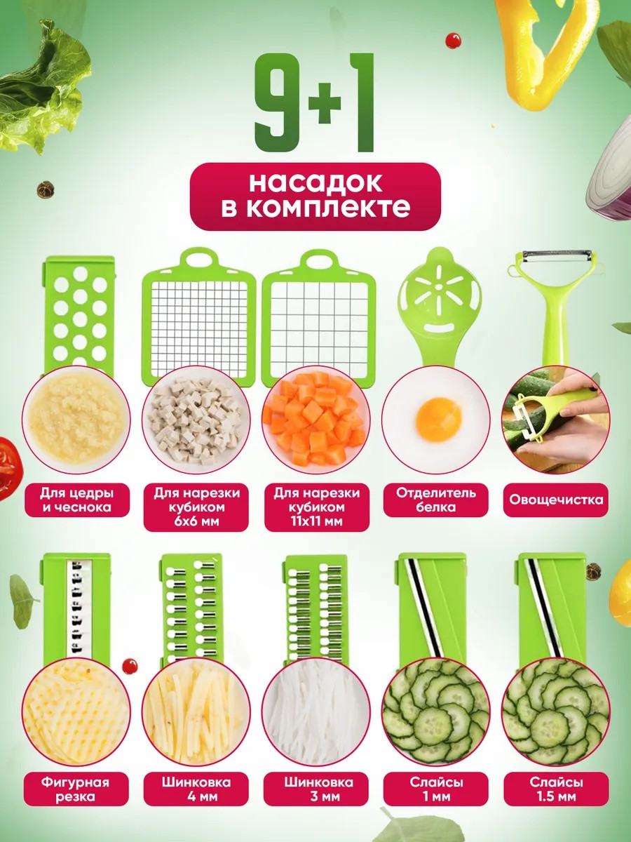 Овощерезка ручная 14в1 - это лучшее приспособление для кухни! Отличный подарок на 8 марта. Товар с гарантией! Наша терка для овощей имеет в комплекте 7 видов сменных насадок разной толщины, для шинковки, держатель овощей и фруктов, разделитель желтка от белка, сеточка для нарезки, контейнер для хранения овощей, который оснащен резиновыми накладками, чтобы не скользить по поверхности. В подарок идет овощечистка! Для защиты ваших рук, фигурный слайсер разработан с держателем, который сохранит ваши пальцы в безопасности. Наша кухонная терка с контейнером выполнена из высококачественного ABS пластика. Хранение на кухне - одно из преимуществ компактных габаритов. Многофункциональная капусторезка молния выполняет большое количество функций и может служить заменой для таких предметов, как винегретница ; ломтерезка, мультирезка, овощерезка кубиками , нож и овощи чистилка; шинковка для капусты , измельчитель лука, измельчители и соковыжималки , мультислайсер и слайсер универсальный. Также она сможет заменить вам такой инвентарь для кухни, как терка для корейской моркови (моркови по корейски), электрическая капуста резка, картофелерезка и фрукторезка. Такой кухонный набор красивой посуды можно взять с собой для пикника и отдыха на природе. Овощерезка с контейнером шинкует овощи и фрукты разными способами и при этом ничего вокруг не пачкается. Механическая терка, намного лучше чем овощерезка электрическая потому что не требует лишних затрат. В нашем наборе мясорубка для овощей и посуда (контейнер) - все в одном! Измельчитель ручной имеет в комплекте специальную вилку для удаления застрявших кусочков еды в прессе. Хорошо подходит, как подарок (подарочный набор) женщине, маме, бабушке, коллеге и теще. В каждом наборе имеется гарантийный талон с данными для обращения по всем вопросам. Успейте купить по доступной цене пока длится период акций и скидок.