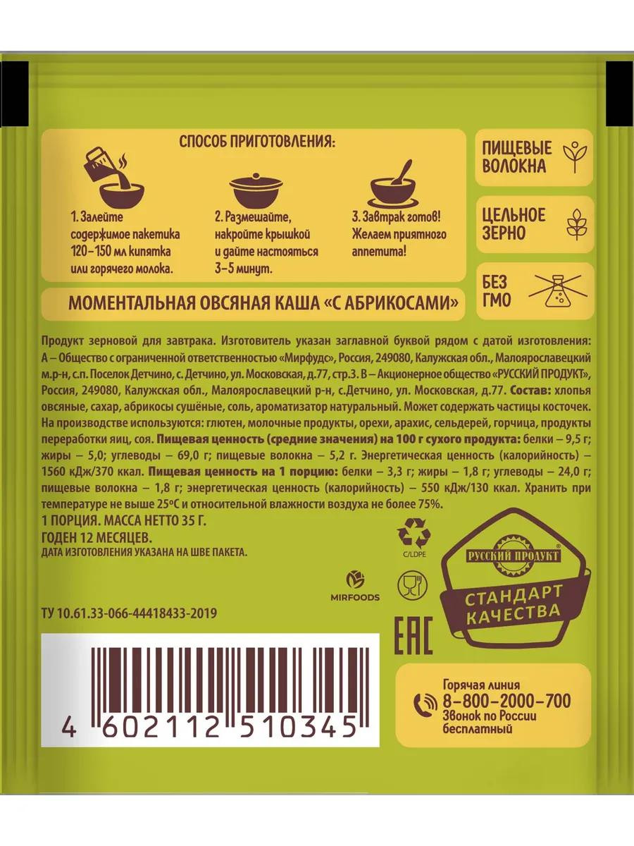 Это продукт, который обязательно должен быть в вашем арсенале для приготовления быстрых завтраков. Моментальная каша из овсяных хлопьев "Дачный сезон" - беспроигрышный вариант быстрого, вкусного и полезного завтрака! Каша имеет нежную консистенцию, приятный вкус и содержит натуральные пищевые волокна, которые при регулярном употреблении помогают улучшить пищеварение. В абрикосе содержится пектин - полезное вещество, которое регулирует работу кишечника и снижает холестерин. Отборный продукт без красителей, консервантов и ГМО. Продукты быстрого приготовления - это именно то, что нужно современному человеку, ценящему свое время. Вам больше не нужно проводить целые часы у плиты, чтобы насладиться домашней едой. Просто откройте пакетик с кашей и добавьте горячую воду - завтрак готов! Благодаря чистым продуктам вы можете наслаждаться этой кашей везде, особенно удобно в поездках и путешествиях. Будь то завтрак или перекус - эта крупа подарит вам бурю незабываемых впечатлений благодаря сочетанию овсянки и абрикоса. Начните свое утро правильно с полезными продуктами питания! В линейке бренда вы найдете каши быстрого приготовления с клубникой, малиной, черникой, курагой и клюквой. Способ приготовления: 1. Содержимое пакета залить 120-150 мл кипятка или горячего молока, размешать. 2. Накрыть крышкой. Настаивать 3-5 минут. 3. Готово! Быстрый и полезный завтрак каждый день! Приятного аппетита! Произведено в России.