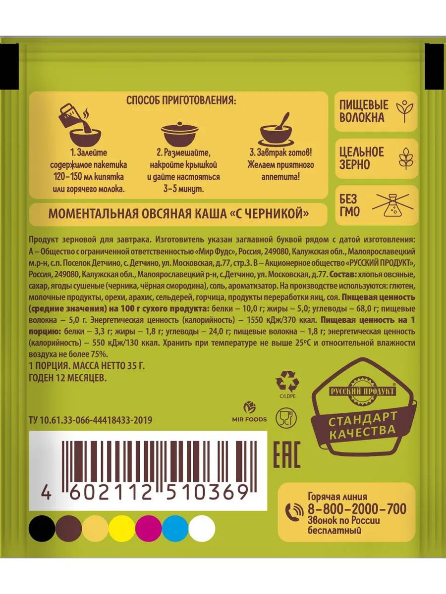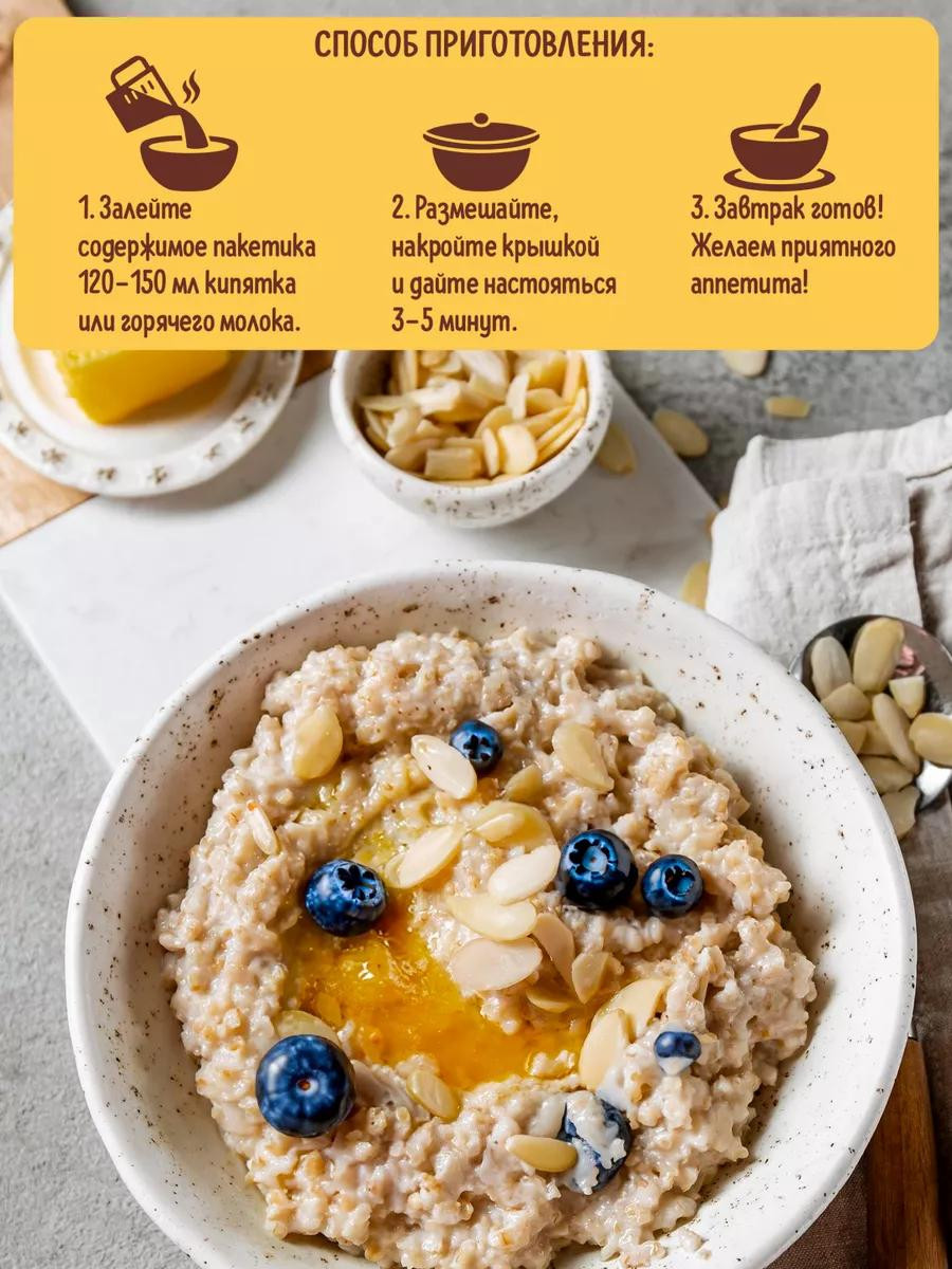 Это продукт, который обязательно должен быть в вашем арсенале для приготовления быстрых завтраков. Моментальная каша из овсяных хлопьев "Дачный сезон" - беспроигрышный вариант быстрого, вкусного и полезного завтрака! Каша имеет нежную консистенцию, приятный вкус и содержит натуральные пищевые волокна, которые при регулярном употреблении помогают улучшить пищеварение. Приготовить ароматную кашу с черникой можно всего за пару минут - прекрасное начало дня и заряд бодрости! Черника - источник витаминов и природных антиоксидантов, невероятно полезна для зрения и улучшает работу сердечно-сосудистой системы. Отборный продукт без красителей, консервантов и ГМО. Продукты быстрого приготовления - это именно то, что нужно современному человеку, ценящему свое время. Вам больше не нужно проводить целые часы у плиты, чтобы насладиться домашней едой. Просто откройте пакетик с кашей и добавьте горячую воду - завтрак готов! Благодаря чистым продуктам вы можете наслаждаться этой кашей везде, особенно удобно в поездках и путешествиях. Будь то завтрак или перекус - эта крупа подарит вам бурю незабываемых впечатлений благодаря сочетанию овсянки и черники. Начните свое утро правильно с полезными продуктами питания! В линейке бренда вы найдете каши быстрого приготовления с абрикосом, клубникой, малиной, курагой и клюквой. Способ приготовления: 1. Содержимое пакета залить 120-150 мл кипятка или горячего молока, размешать. 2. Накрыть крышкой. Настаивать 3-5 минут. 3. Готово! Быстрый и полезный завтрак каждый день! Приятного аппетита! Произведено в России.