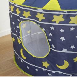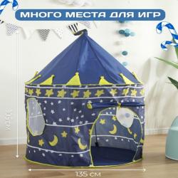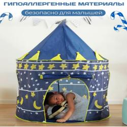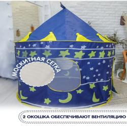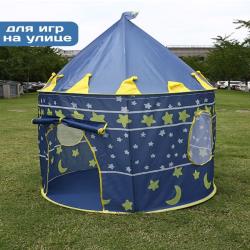 Палатка для детей игровая - прекрасный подарок не только для Вашего ребёнка, но и для Вас! Детский домик способствует развитию малыша. В этом своем мире ребенок учится быть самостоятельным. Он сам наводит порядок, самостоятельно решает, где расположить вещи, как встретить гостей, являясь хозяином, ребёнок сам будет нести ответственность свою игровую палатку, что позволит ему в игровой форме понять ценность вещей, необходимость ухода за своим жилищем. Просторная домашняя палатка помогает развивать воображение. В своем маленьком мире ребенок сможет психологически огородиться от стресса и большого мира, который его окружает, шатер поможет ему в этом. Игровой дом-шалаш поможет расслабиться и разгрузиться вашему ребёнку. Когда в доме есть палатка, вам не придется постоянно убирать за ребенком вещи для строительства убежища. Дом для детей уже построен. У ребёнка появится свой собственный укромный уголок для игр. Меньше разбросанных игрушек по дому, будьте уверены - они все будут в палатке. Дети с удовольствием используют игровой домик-палатку: для чтения, изучения уроков, рисования и других занятий. Палатка прекрасно подходит для игр дома и на улице. Шатер детский идеально подойдет для игр летом на даче. Наша игровая палатка легко разбирается и собирается. Установка палатки детской игровой происходит за считанные минуты. Игровой домик – три в одном выполнен из безопасных материалов. Материал Таффета 190Т: непромокаемый, способен быстро сохнуть, легко разглаживается в собранном виде. В сложенном виде палатка не занимает много места для хранения и имеет хорошо продуманную конструкцию. Просторная игровая палатка может вместить несколько детей. Детская палатка подходит как для девочек, так и для мальчиков. Характеристики: Материал палатки: Таффета 190Т Цвет: Синий Комплектация: Палатка - 1шт. Дуга - 4шт. Сумка - 1шт. Инструкция - 1шт. Диаметр: 105 см. Высота: 135 см. Размер окна: 25х35 см.