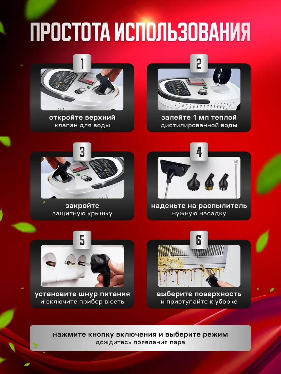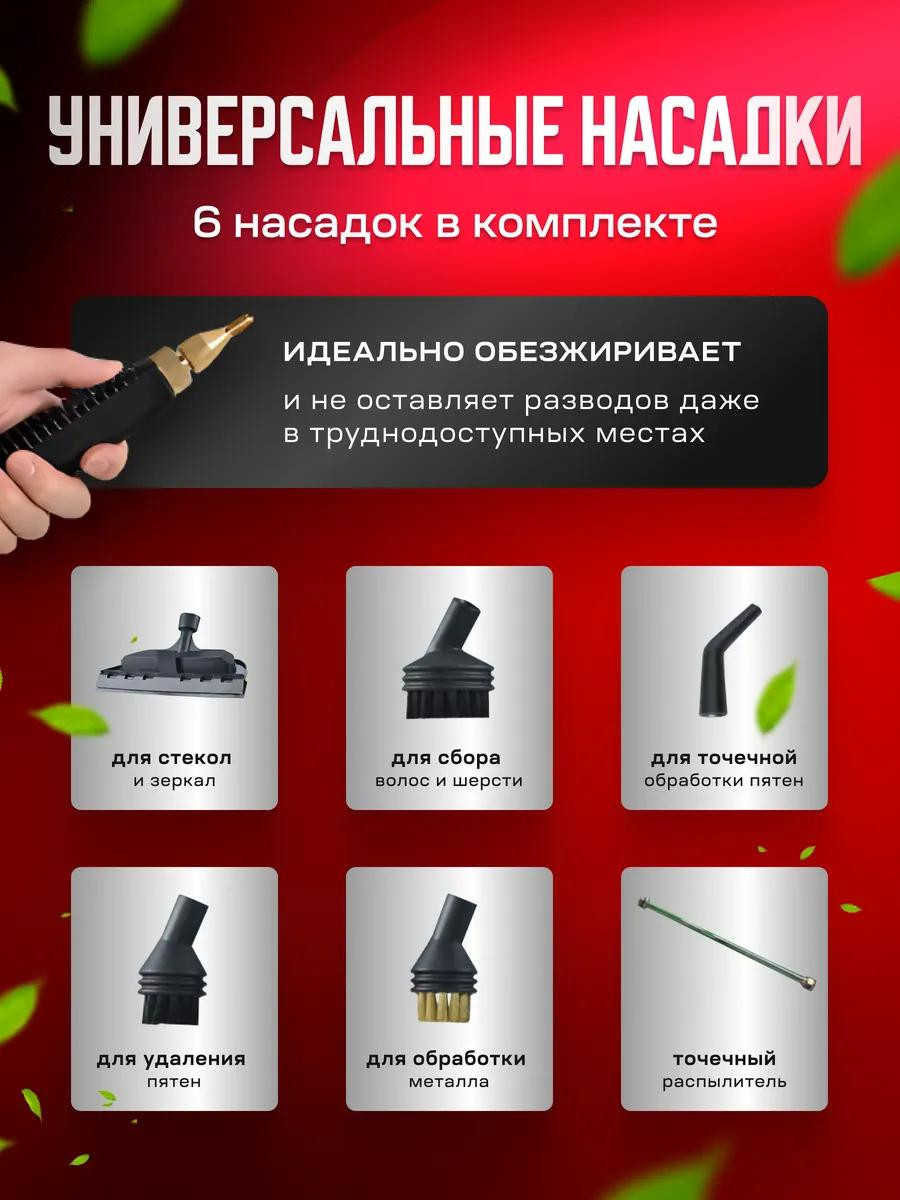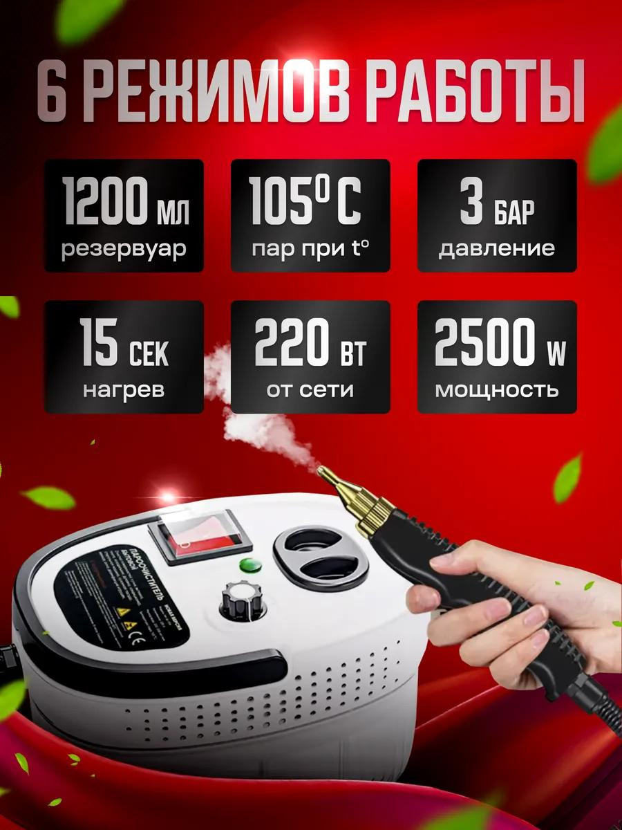 Пароочиститель оснащен антинагревающим пистолетом, позволяющим дезинфицировать детские вещи, очищать шторы, ковры и мягкую мебель, а также эффективно удалять жир и налет на кухне. Универсальные насадки подходят для мытья окон, чистки кафеля и освежения других поверхностей. Компактный размер и 6 режимов работы делают его удобным для использования дома и на даче.