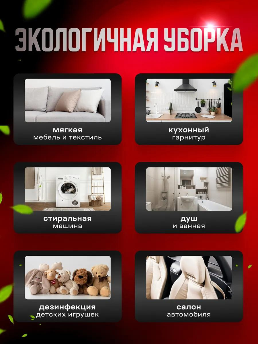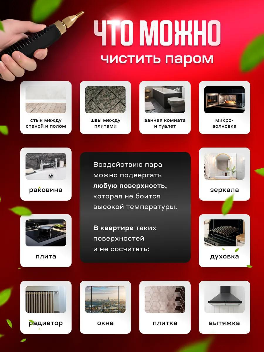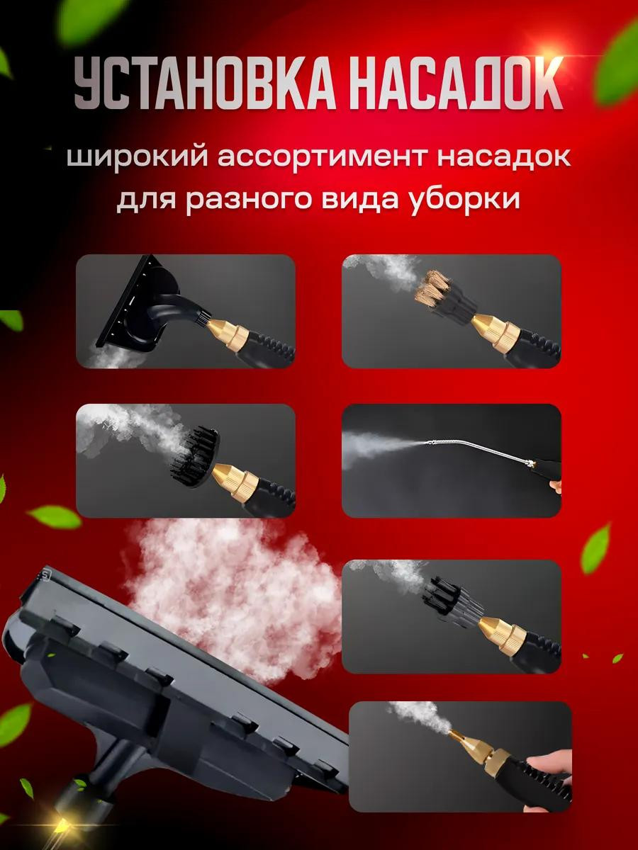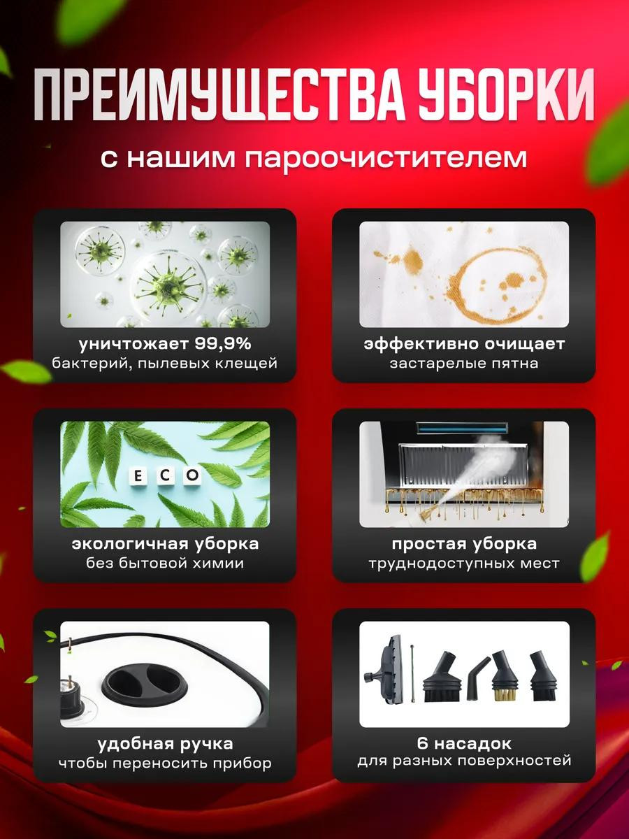 Пароочиститель оснащен антинагревающим пистолетом, позволяющим дезинфицировать детские вещи, очищать шторы, ковры и мягкую мебель, а также эффективно удалять жир и налет на кухне. Универсальные насадки подходят для мытья окон, чистки кафеля и освежения других поверхностей. Компактный размер и 6 режимов работы делают его удобным для использования дома и на даче.