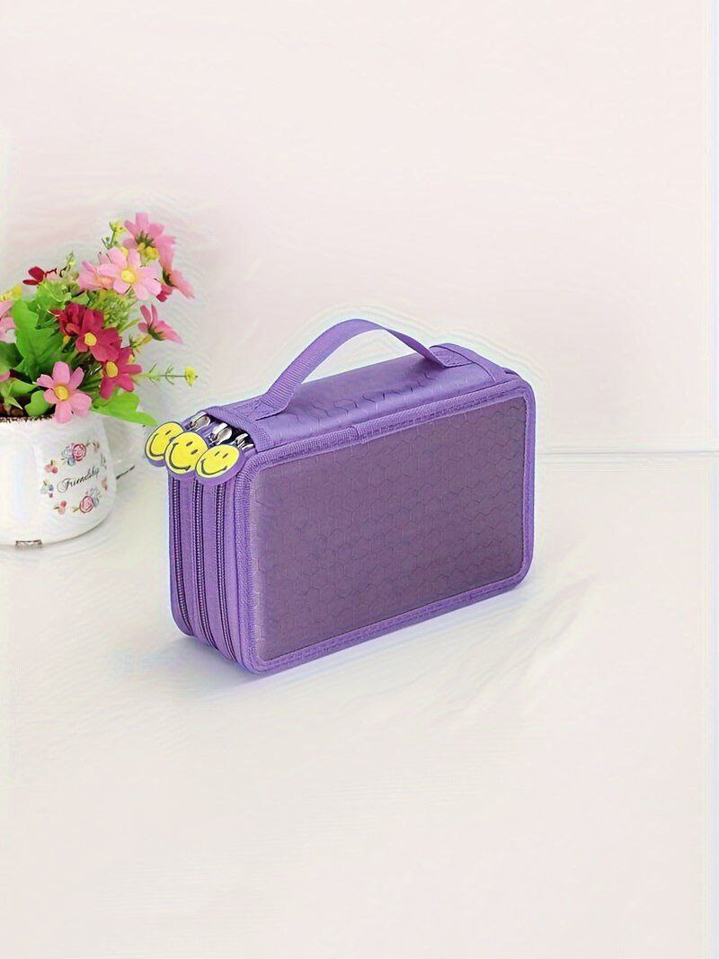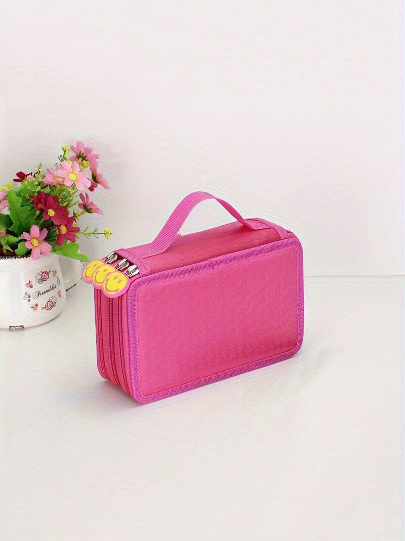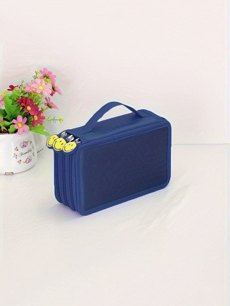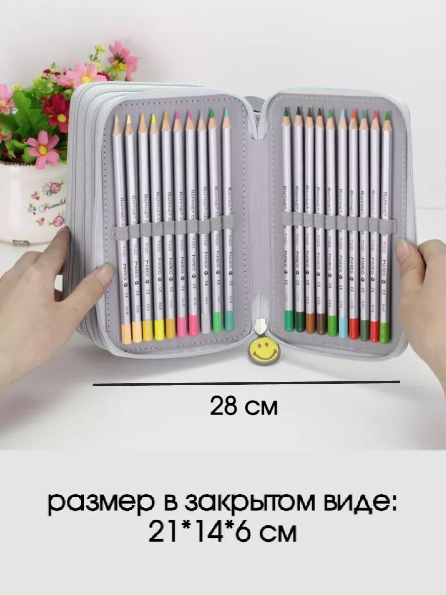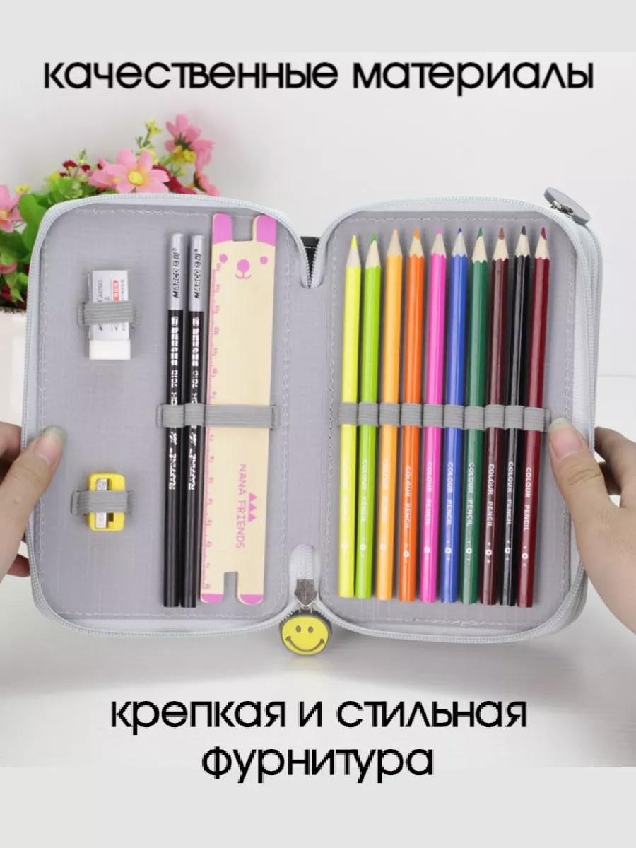 Универсальный школьный пенал с тремя вместительными отделениями на молнии. Выполнен из плотного текстиля с фактурным узором. Внутри — эластичные фиксаторы для канцелярии, удобное размещение карандашей, ручек, линеек и мелочей. Оснащён прочной ручкой для переноски и яркими бегунками в виде смайликов.