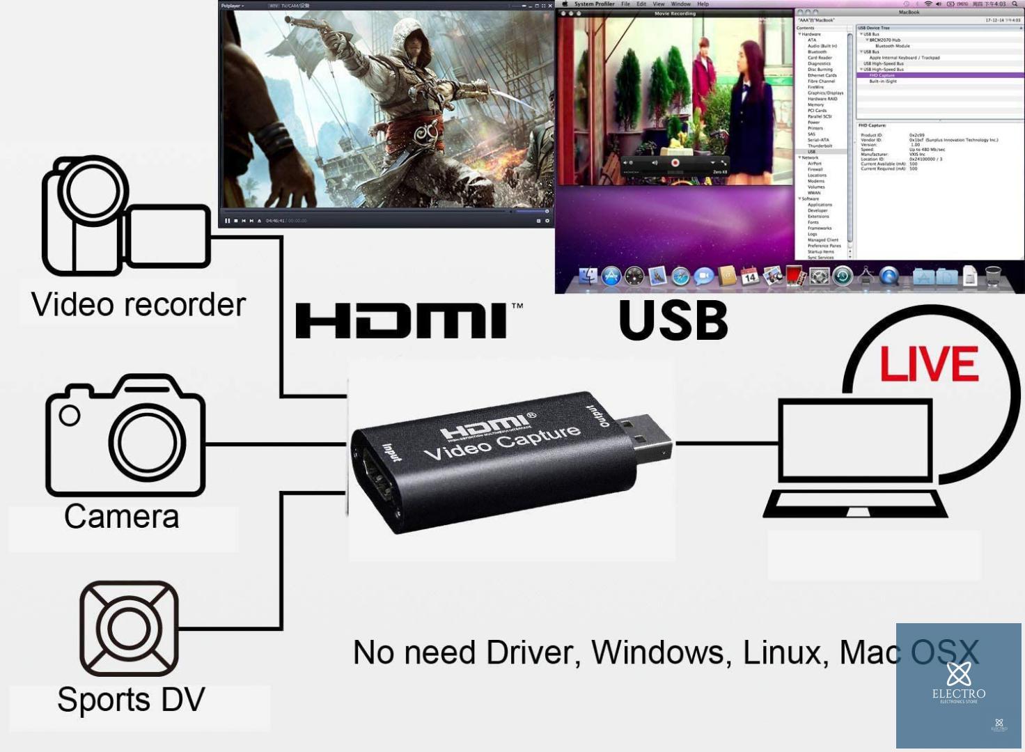 【Устройство видеозахвата HDMI】 Устройство видеозахвата HMDI поддерживает разрешение 1080P@30fps (макс.)/720P@30fps/VGA. Захват USB Подходит для прямой трансляции и записи, запись игры 1080P Live Streaming Video Game Grabber Converter Без драйвера, Windows, Linux, Mac OSX, минимальная задержка / задержка, прямая трансляция для Xbox One PS.【USB HDMI Capture Драйвер не требуется】 Продукт не включает программное обеспечение для редактирования видео, вы можете использовать обычное программное обеспечение для захвата видео. USB Capture поддерживает множество профессиональных программ для захвата и редактирования видео. наше устройство совместимо с большинством сторонних программ, таких как OBS Studio и AMCap. * См. список совместимости программного обеспечения в описании. Совместимость с Windows 7/8.1/10 и Mac OS 10.12 или более поздней версии.【Карта захвата HD-камеры】 Кабель и порт USB 2.0/3.0 обеспечивают скорость до 100 МБ/с. Вы можете уменьшить задержку в живом видео или записи игры. Отлично подходит для игр, встреч или прямых трансляций на Youtube, Twitch и т. д.! Это устройство plug-n-play и простое в использовании, не нужно загружать драйверы.【Портативная карта захвата HDMI】 Легко подключите цифровую зеркальную камеру, видеокамеру или экшн-камеру к ПК или Mac. Обратная связь в режиме реального времени. Снимайте и создавайте с помощью ваших любимых инструментов. Подходит для получения изображений высокой четкости, записи обучения, медицинской визуализации и т. д.【InBox】1 шт. 1080P HDMI для захвата видео USB, 1 шт. расширенный ящик для хранения. Размер мини-видеорегистратора: 2,4*1,1*0,3 дюйма и вес: 2 унции/50 г. Гарантия: Abunro предоставляет клиентам 30-дневную гарантию возврата денег и неограниченную гарантию на один год, что означает, что мы обеспечим вас! Свяжитесь с нами для простого и быстрого решения.