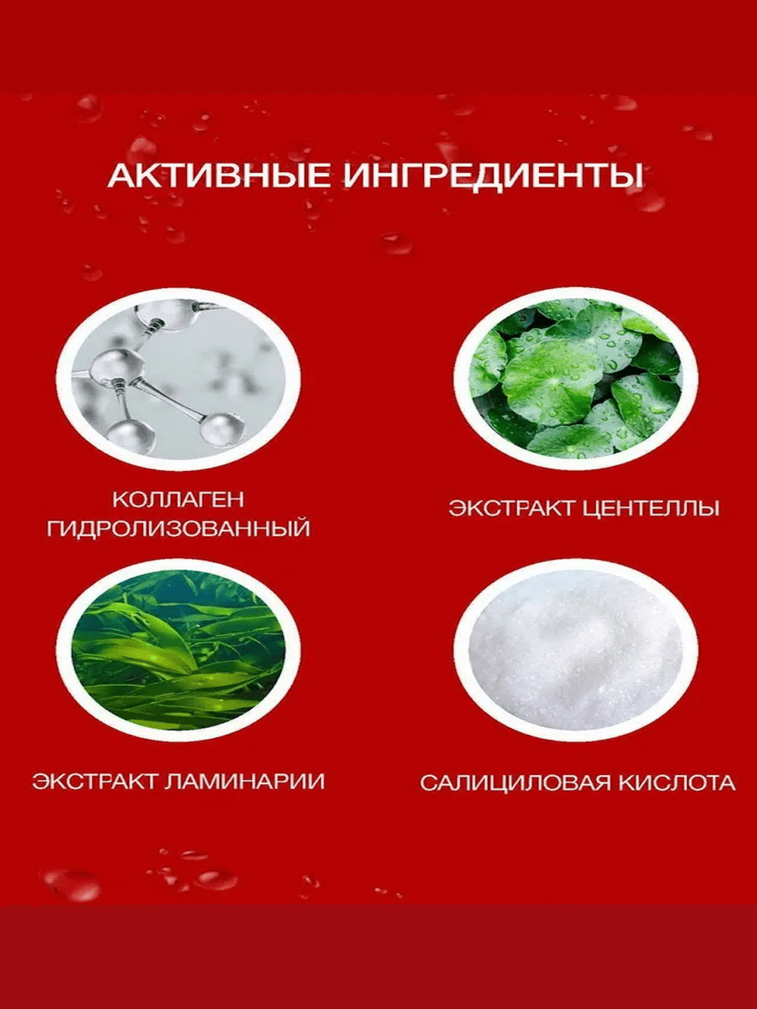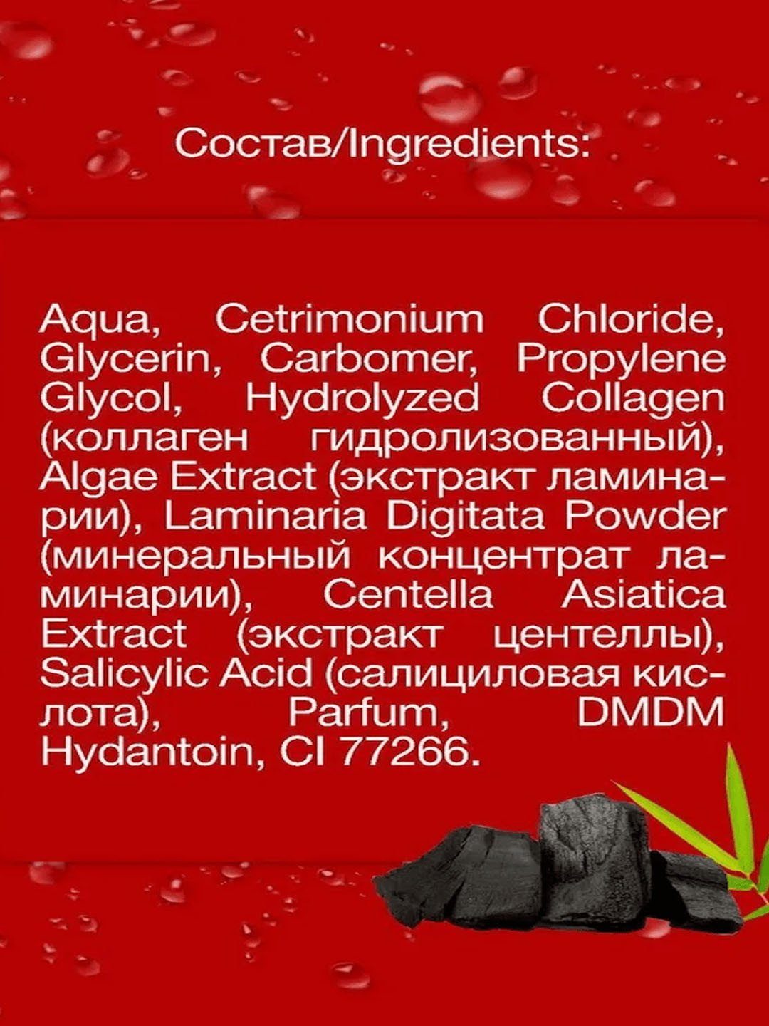 Aqua, Cetrimonium Chloride, Glycerin, Carbomer, Propylene Glycol, Hydrolyzed Collagen (коллаген гидролизованный), Algae Extract (экстракт ламинарии), Laminaria Digitata Powder (минеральный концентрат ламинарии), Centella Asiatica Extract (экстракт центеллы), Salicylic Acid (салициловая кислота), Parfum, DMDM Hydantoin.