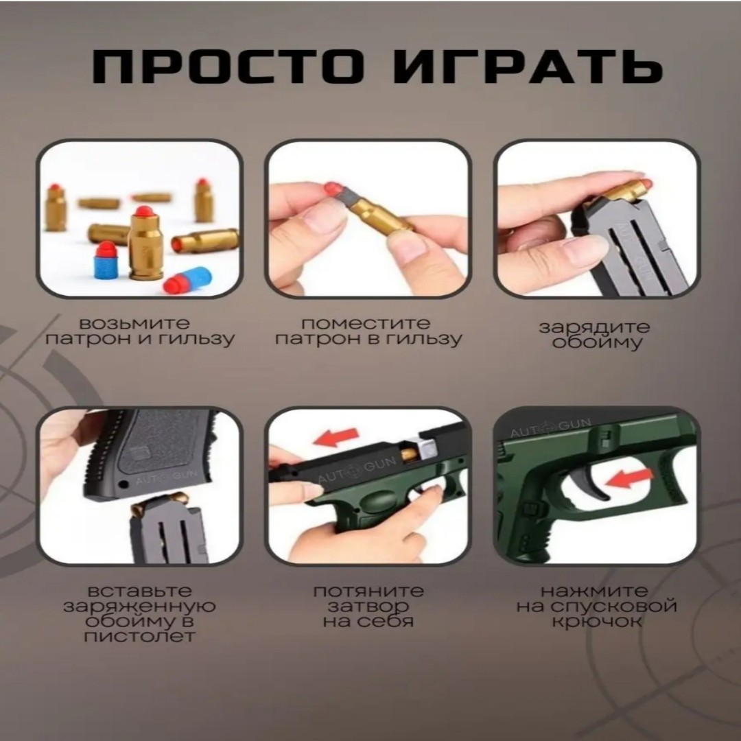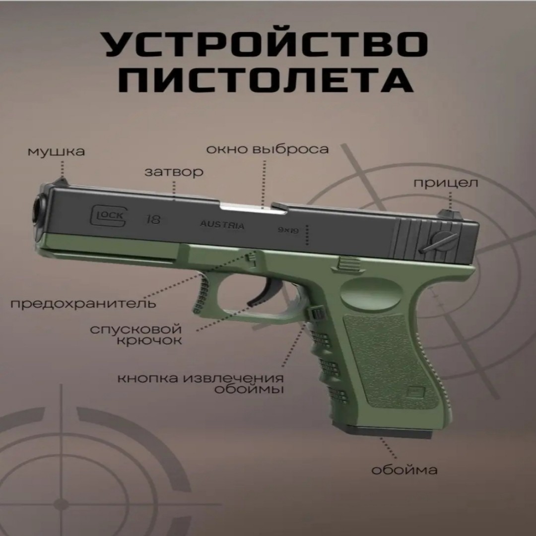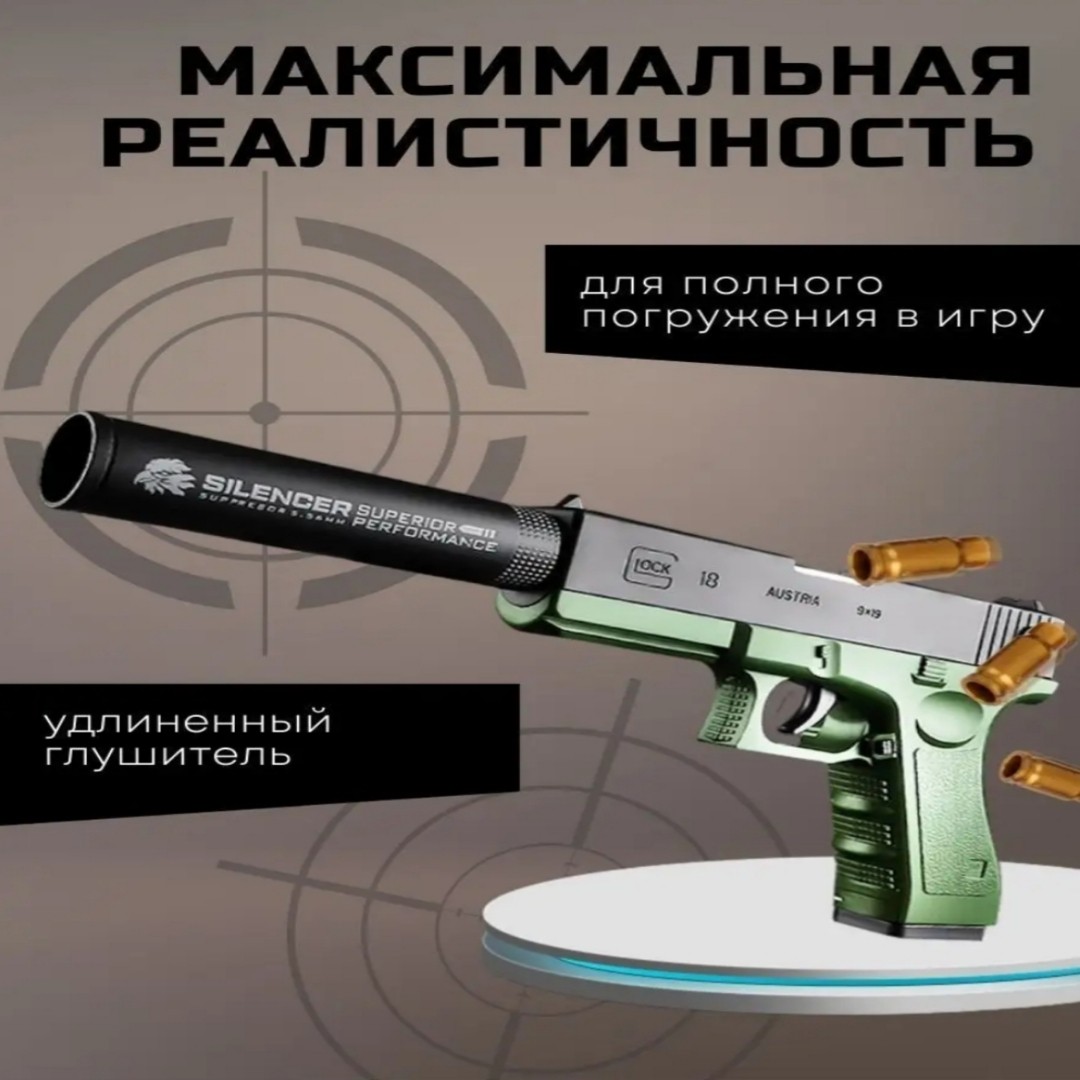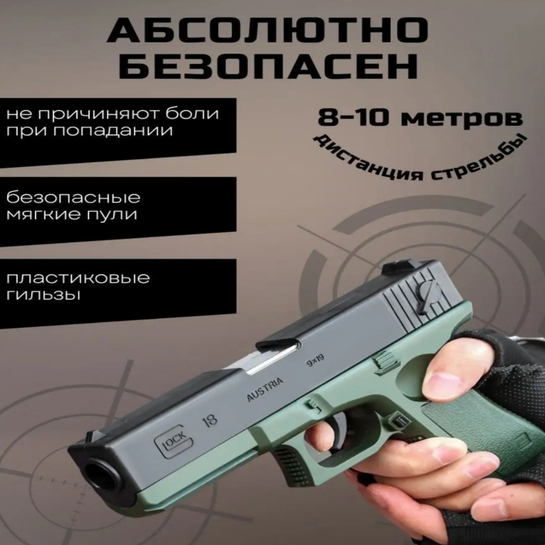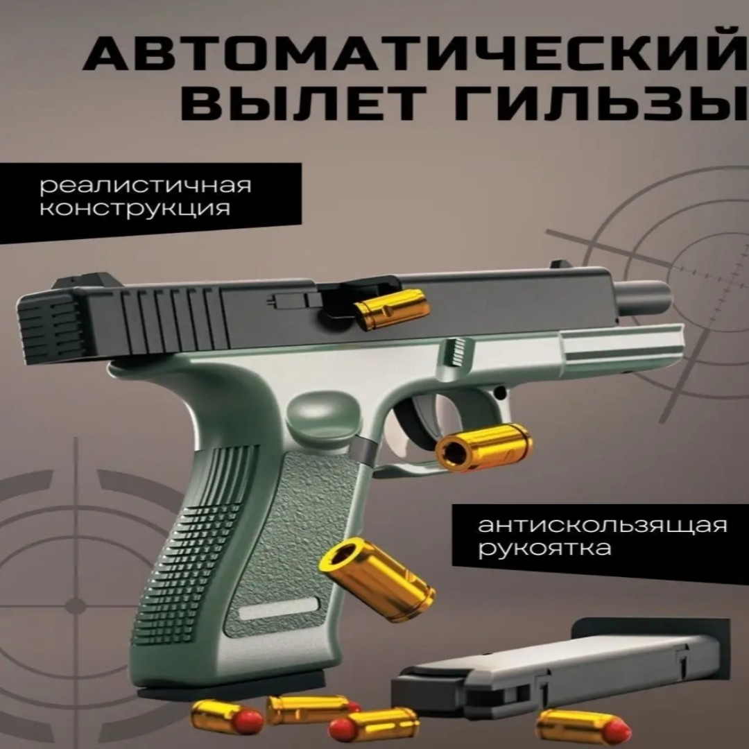 Пистолет детский игрушечный с мягкими пульками Глок – максимально реалистичное детское оружие. Дизайн игрушечного пистолета – это копия настоящего австрийского пистолета Glock 18. Уникальная конструкция игрушечного оружия позволяет автоматически выбрасывать гильзы, создавая ощущения полного погружения в игру. РУЧНОЙ ЗАТВОР Пневматический автомат пистолет, стреляющий пульками, прост в использовании. Стоит только потянуть затвор, и он перезарядится. Автоматический выброс гильзы, детская пневматика со звуком затвора — всё это бластер на пульках. Дистанция стрельбы 8-10 метров. АБСОЛЮТНО БЕЗОПАСЕН Боеприпасы для военных игрушек состоят из пластика и легкого губчатого материала при попадании не причиняют боли. Крутое детское игрушечное оружие и аксессуары заменяет травматический пистолет, пневмат и травмат, за счет своей реалистичной конструкции делает игру интересной и безопасной. УСТРОЙСТВО ПИСТОЛЕТА Изготовлен из надежного безопасного пластика и ударопрочного материала, а реалистичный внешний вид даёт возможность придумывать яркие истории и игры для детей (standoff 2, cs go, майнкрафт, фортнайт, и др.). Съёмная обойма и удлиненный глушитель. Противоскользящая текстурированная рукоятка. Многоразовые мягкие патроны. КАК ЗАРЯЖАТЬ Помещаете мягкую пулю в гильзу, затем готовый патрон в обойму, далее обойму в пистолет и наслаждаетесь игрой! ПРЕИМУЩЕСТВА ТОЛЬКО НАШЕГО МАГАЗИНА: Удобный короб для хранения. Комплект из гильз 8 шт. Пистолет с мягкими патронами станет идеальным подарком для детей и подростков на день рождения, 23 февраля или любой другой праздник.