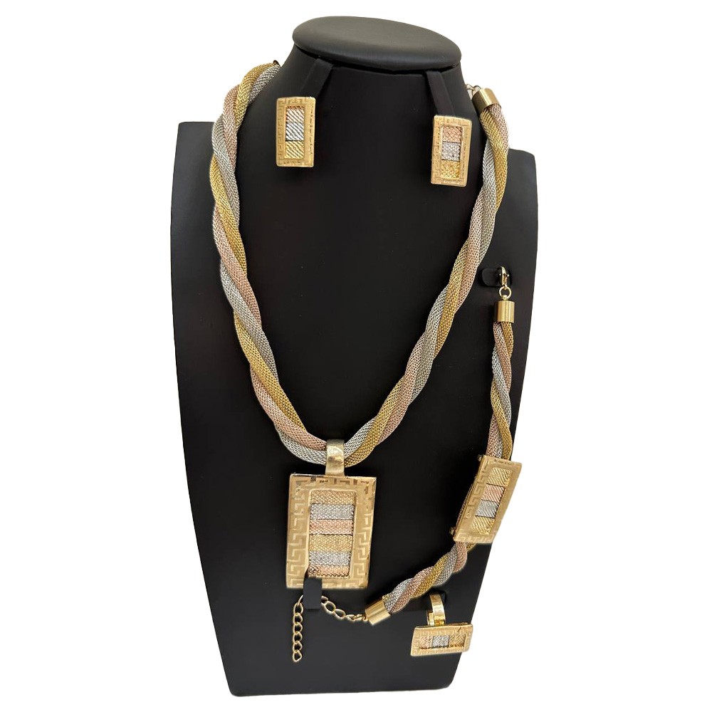 Плетенный массивный комплект из колье, серег, браслета и кольца.