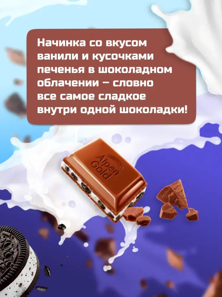 Молочный шоколад Alpen Gold с хрустящими кусочками печенья Oreo и нежной ванильной начинкой. Идеальное сочетание сливочной текстуры и насыщенного вкуса печенья, знакомого каждому.