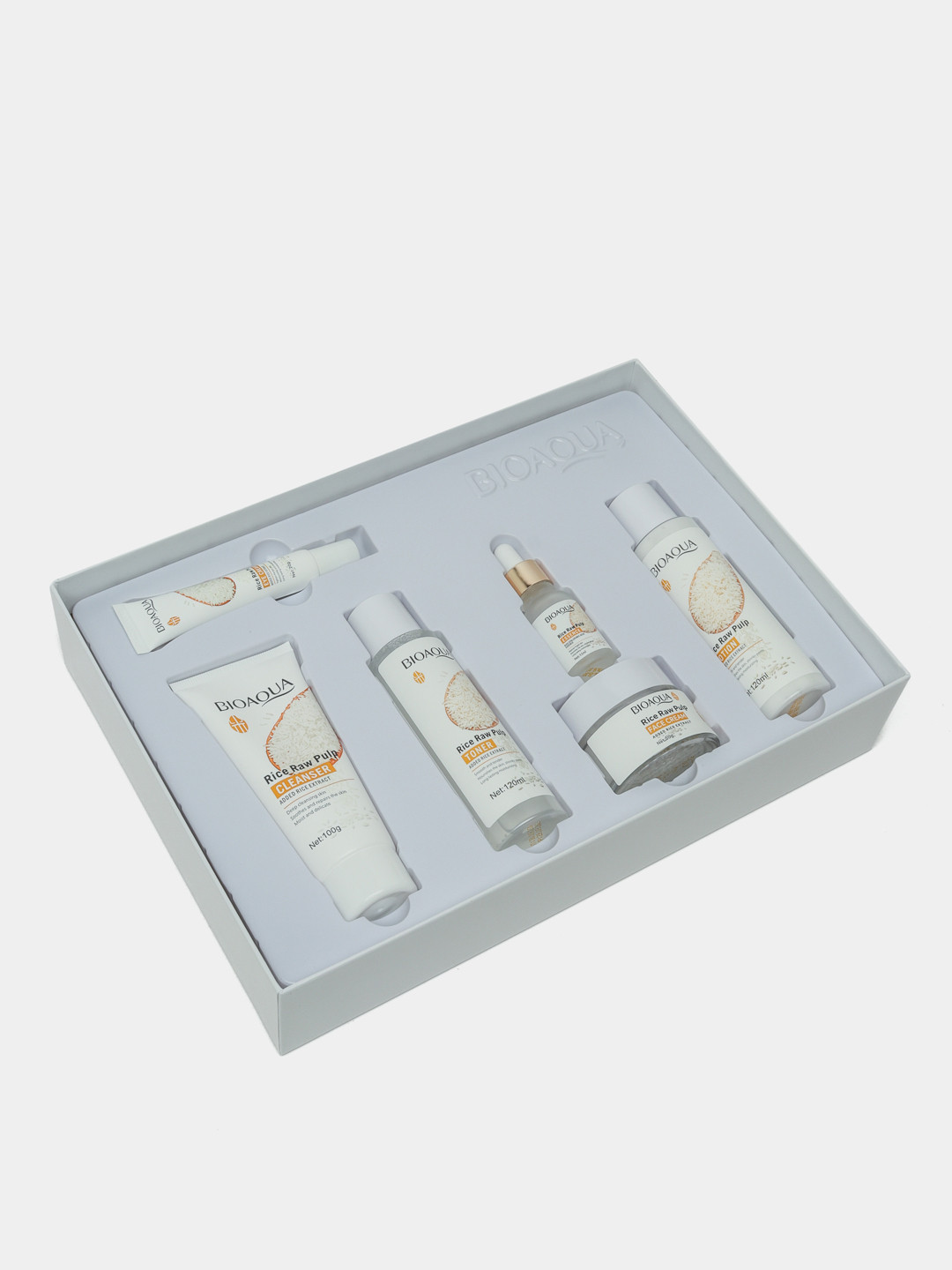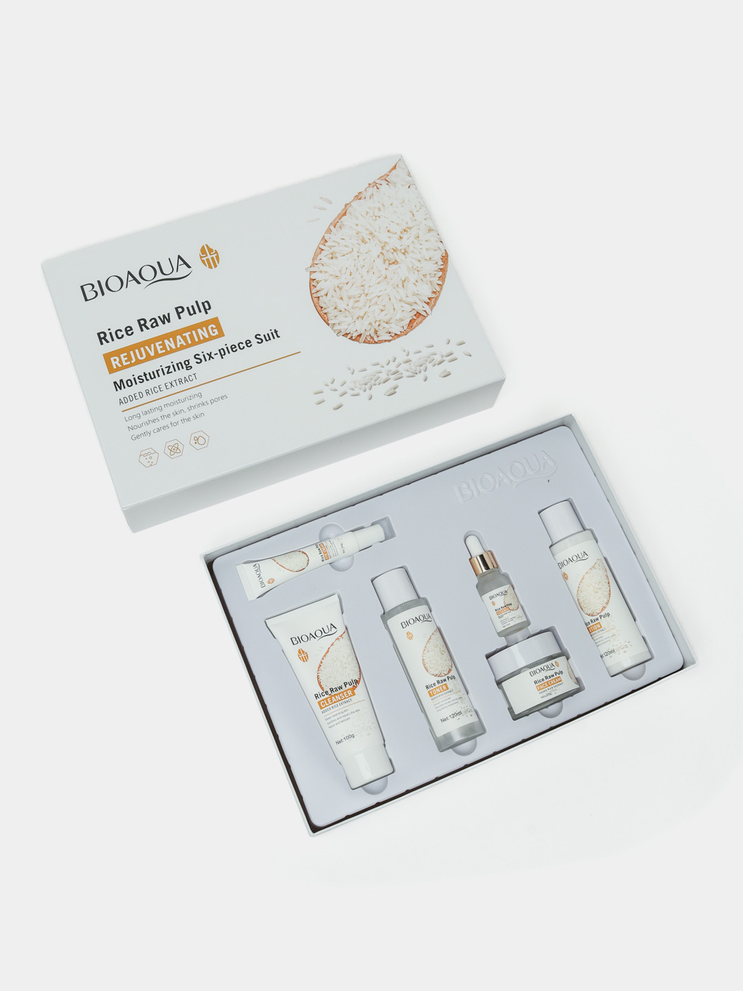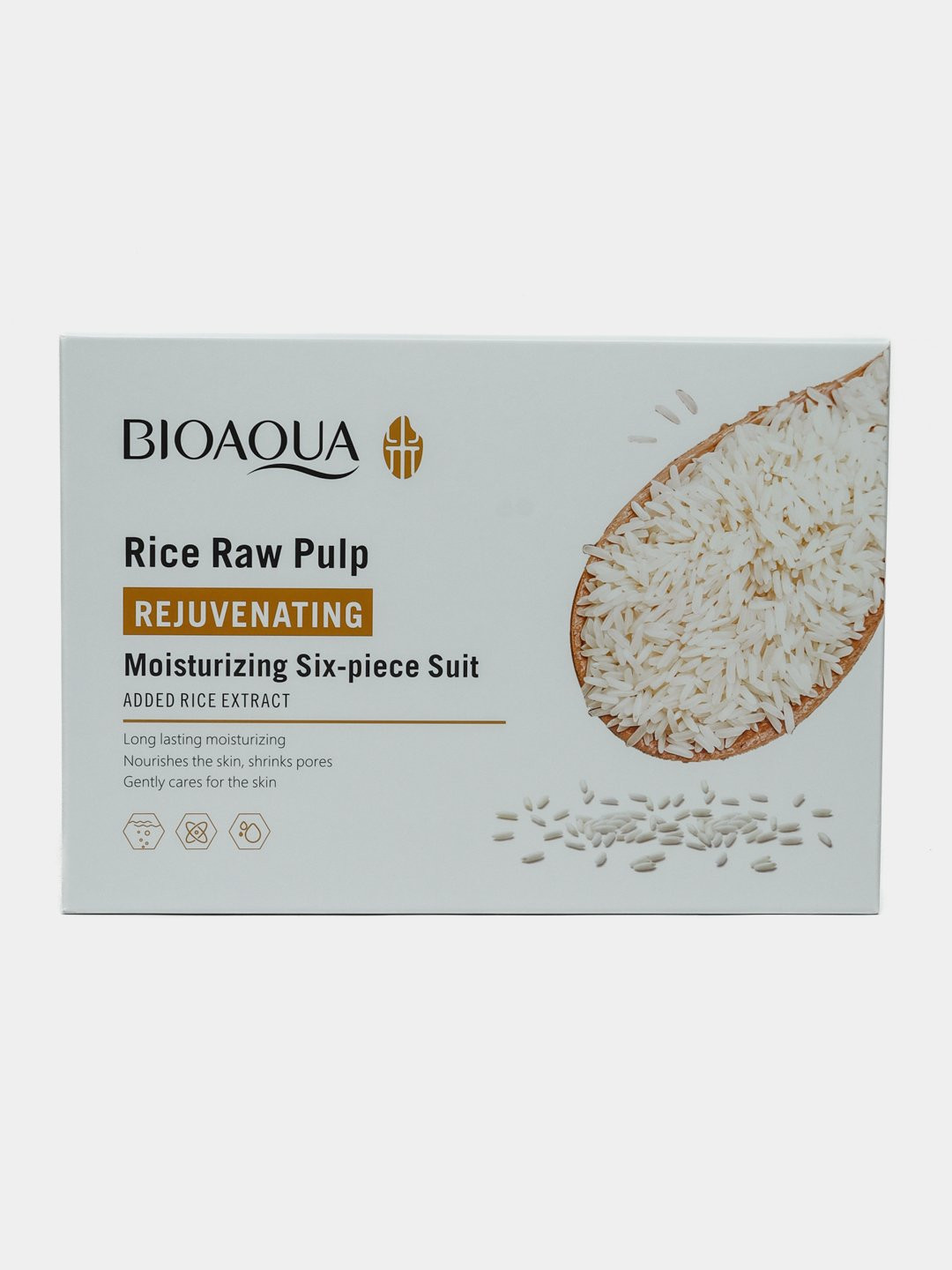 Подарочный набор уходовой косметики для лица с экстрактом риса из 6 средств Биоаква Rice Raw Pulp Rejuvenating представлен в презентабельной красивой коробке состоит из:1. Пенка для умывания объемом 100 мл. Она обладает легкой и густой текстурой.Глубокое очищение кожи от косметики, сохраняя ее естественный баланс влаги, что делает ее незаменимой в любой процедуре ухода за лицом.. Кожа остается чистой, свежей и не стянутой.