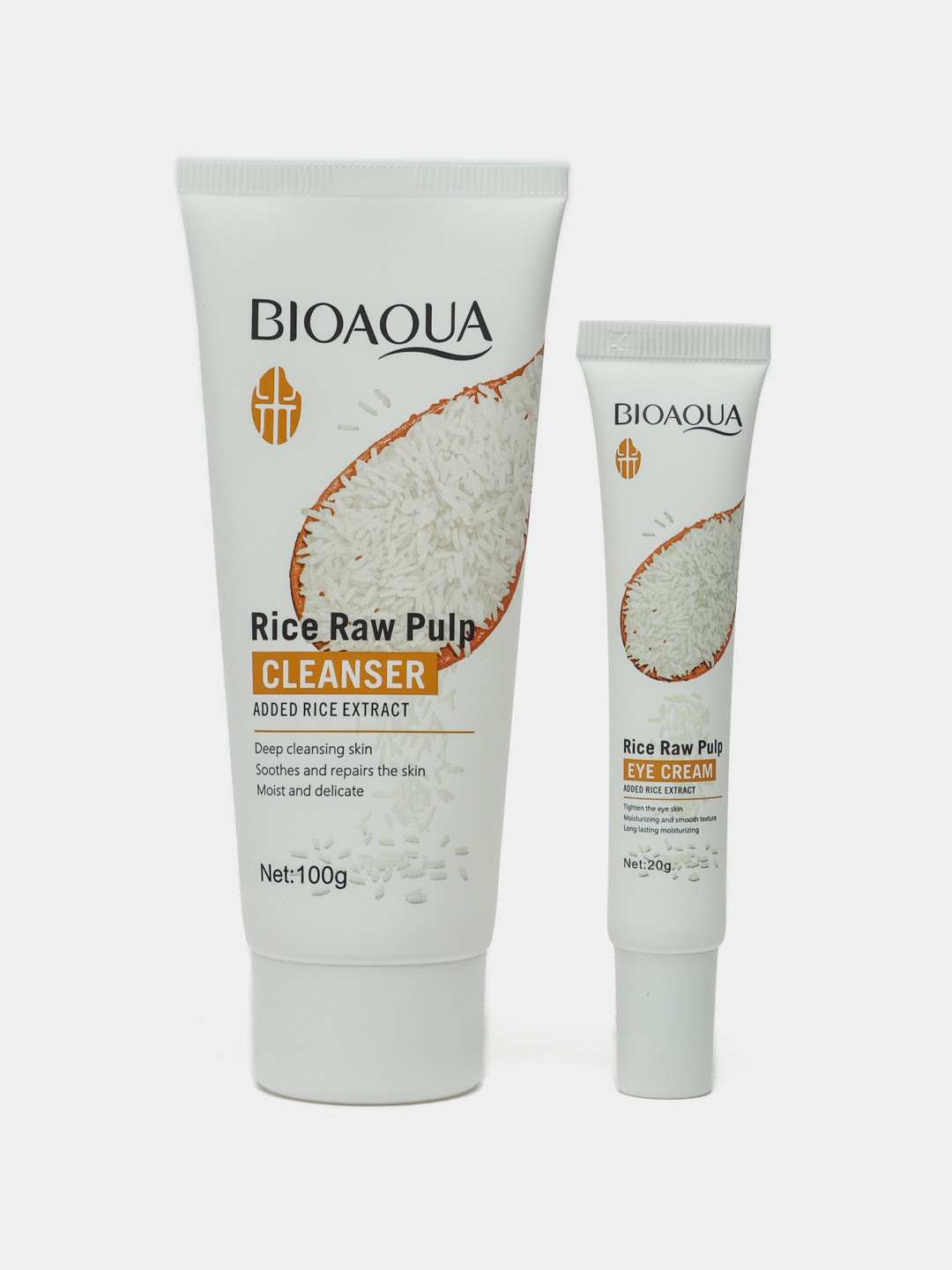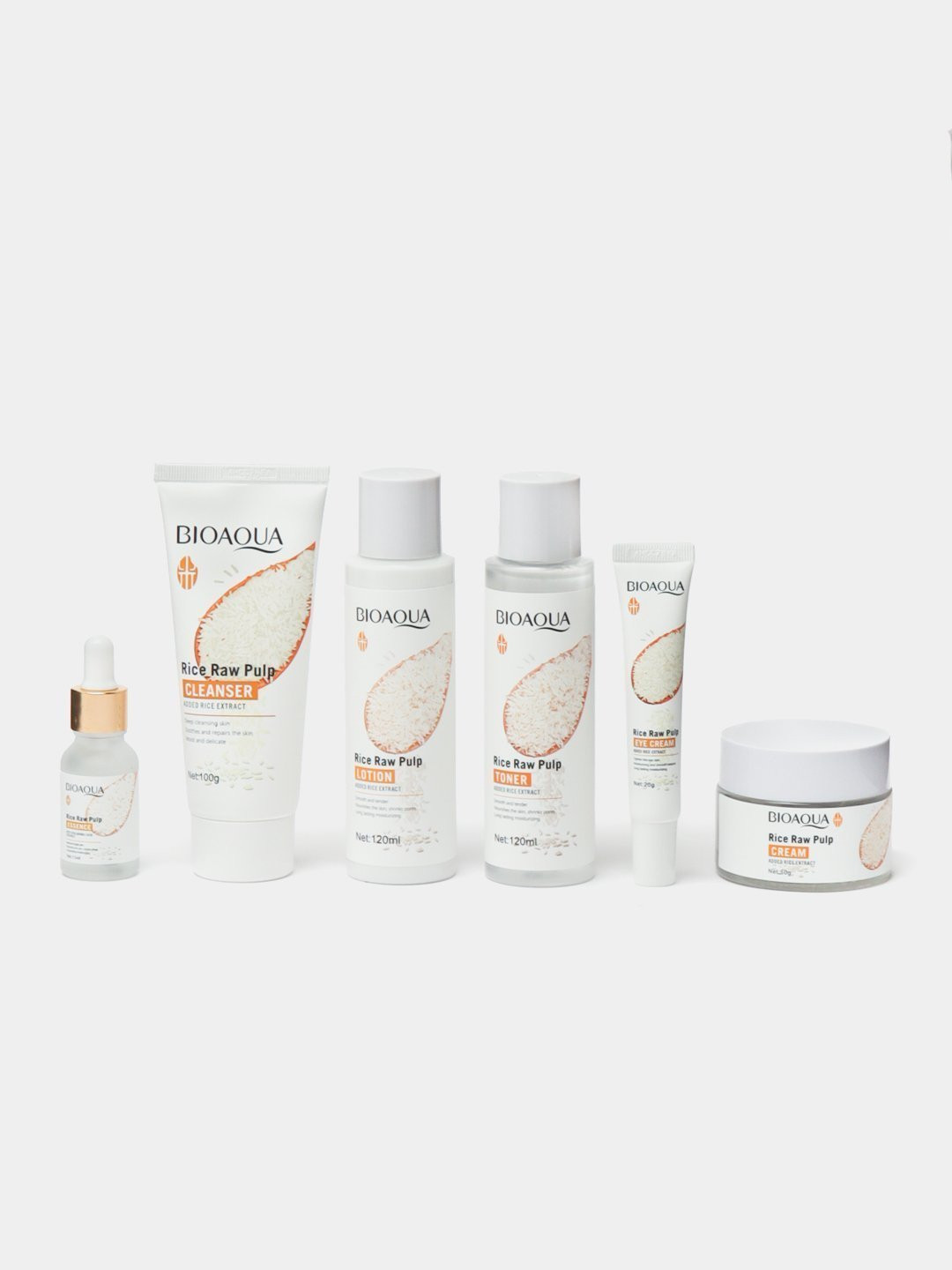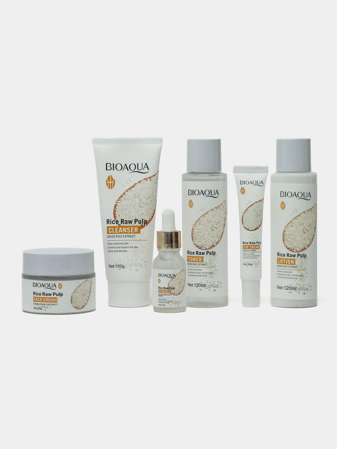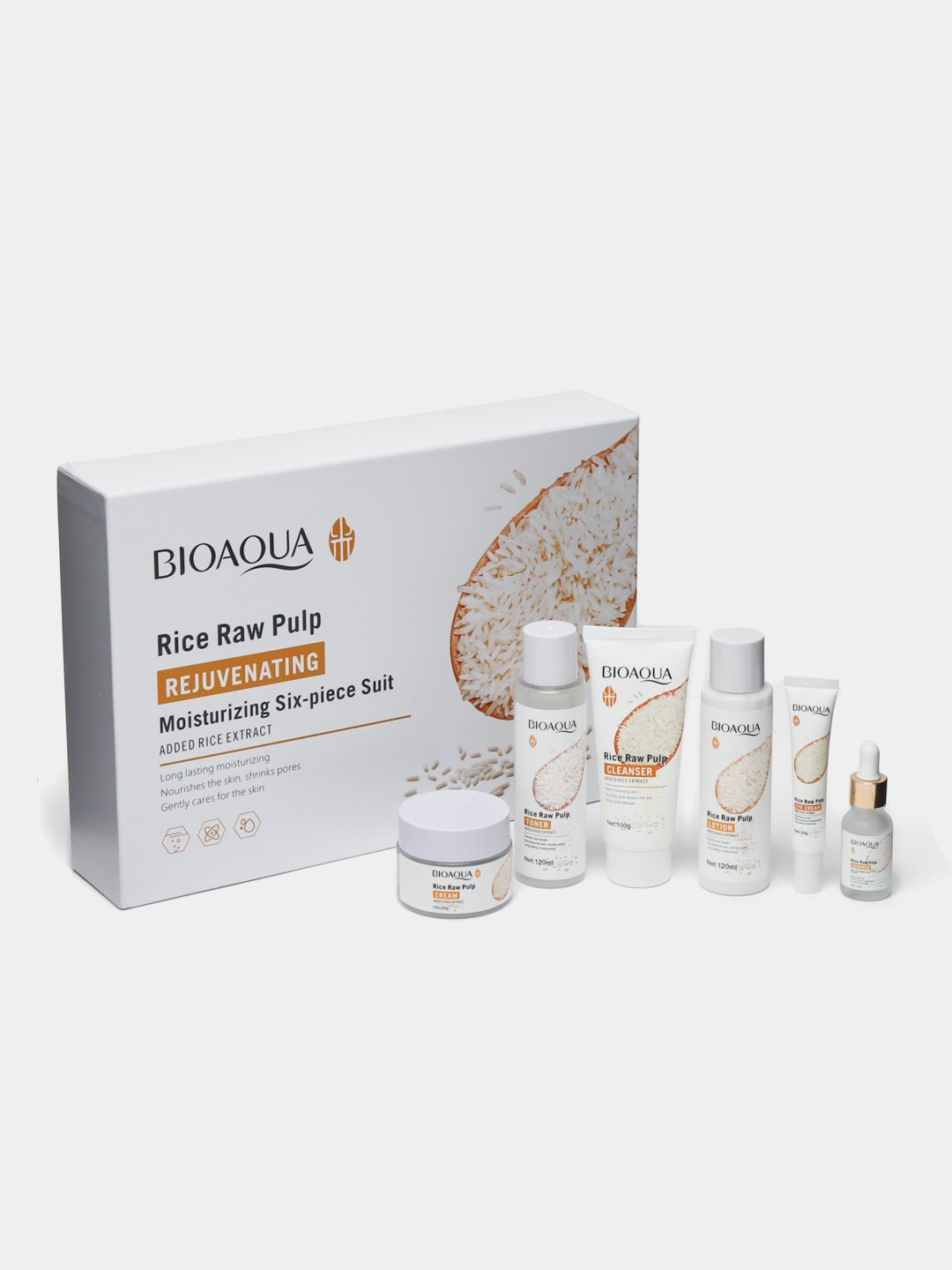 Подарочный набор уходовой косметики для лица с экстрактом риса из 6 средств Биоаква Rice Raw Pulp Rejuvenating представлен в презентабельной красивой коробке состоит из:1. Пенка для умывания объемом 100 мл. Она обладает легкой и густой текстурой.Глубокое очищение кожи от косметики, сохраняя ее естественный баланс влаги, что делает ее незаменимой в любой процедуре ухода за лицом.. Кожа остается чистой, свежей и не стянутой.