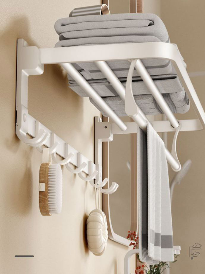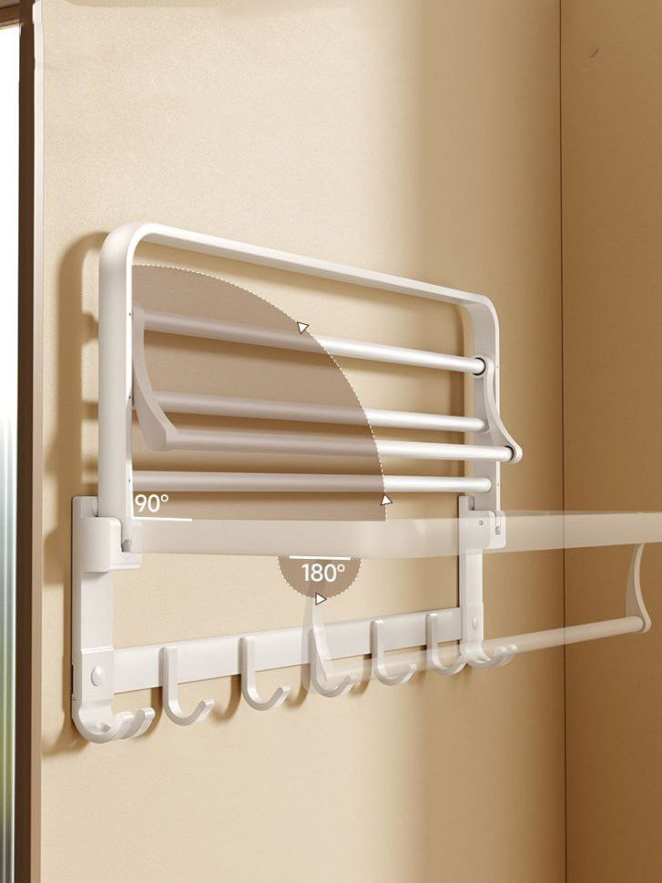 Универсальная настенная полка для ванной комнаты с поворотным механизмом 180° и складной конструкцией. Идеально подходит для хранения полотенец, халатов, аксессуаров и бытовых предметов. Оснащена крючками и дополнительной перекладиной для сушки.