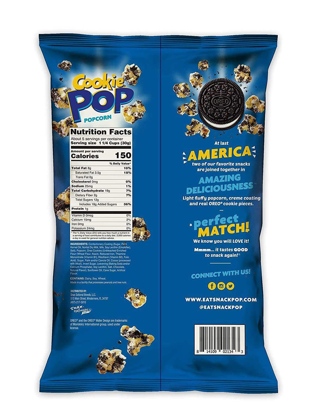 Cookie Pop Popcorn Oreo — это уникальное сочетание воздушного попкорна и настоящих кусочков легендарного печенья Oreo. Лёгкий, хрустящий, с насыщенным вкусом — идеальный десертный снек для сладкоежек! Приготовлен из кукурузы без ГМО, с пониженным содержанием натрия и всего 150 калорий на порцию.