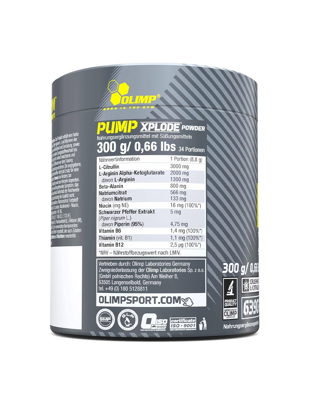 Olimp Pump Xplode – это мощная предтренировочная добавка без кофеина, разработанная для увеличения пампинга, усиления кровотока и повышения выносливости. В составе 3000 мг L-цитруллина и 2000 мг AAKG, способствующих выработке оксида азота, расширению сосудов и улучшенному питанию мышц.