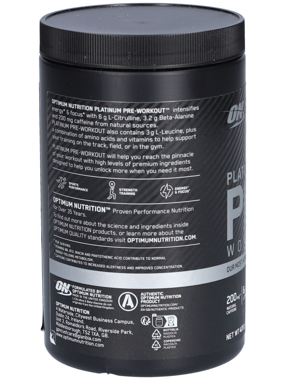 Optimum Nutrition Platinum Pre-Workout — это наш самый мощный и высоко дозированный предтренировочный комплекс, созданный для того, чтобы усилить энергию и концентрацию. С добавлением 6 г L-цитруллина, 3,2 г бета-аланина и 200 мг кофеина из натуральных источников, этот продукт помогает улучшить выносливость, концентрацию и кровообращение, что значительно повышает производительность в тренажерном зале. Вкус фруктового пунша — свежий и насыщенный.