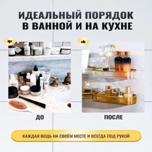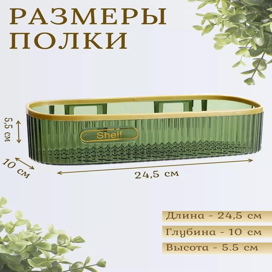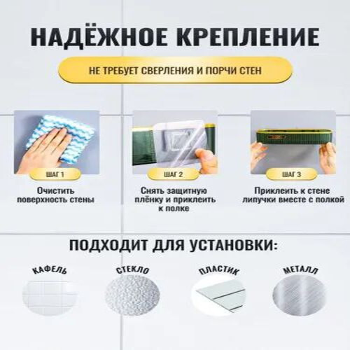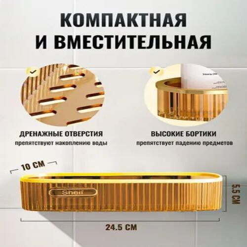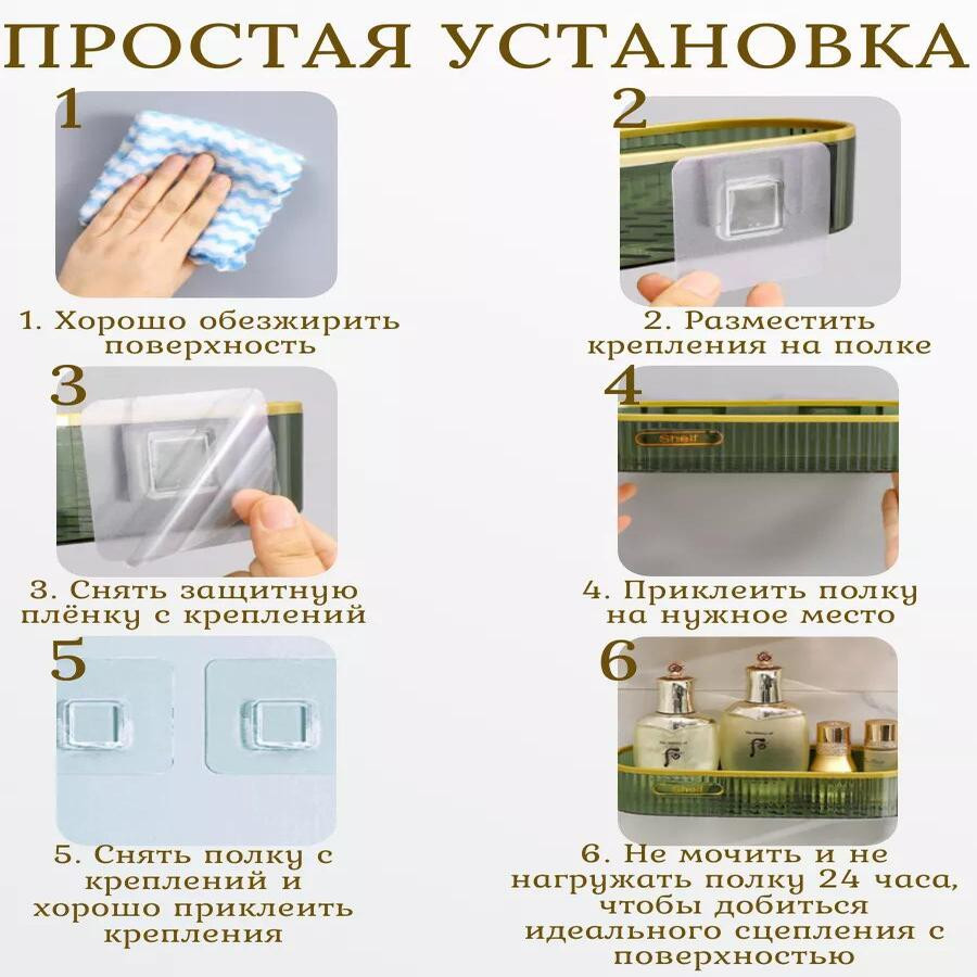 Рекомендации по установке: 1. Отметить место крепления самоклеящихся пластин; 2. Обезжирить место приклеивания пластин; 3. Снять защитную пленку; 4. Сильно прижать пластины в места установки (держать не менее 30 секунд); 5. Установить полку на самоклеящиеся пластины. Важно: после установки не использовать/не мочить 12-20 часов. Полка для ванны – это аксессуар, который поможет сделать вашу ванную комнату или кухню более удобной и организованной. Эта полка предназначена для тех, кто желает воспользоваться преимуществами компактного хранения без необходимости сверления стен или других поверхностей. Подставка - полка проста в установке и не требует специальных инструментов или навыков. Благодаря специальным самоклеящимся креплениям легко крепится к стене. Настенная полка для ванны является идеальным дополнением для душа и туалета. Она придаст вашей ванной комнате уютный и стильный вид. Навесная полочка также подойдет для хранения аксессуаров, таких как дозаторы и щетки. Полка для хранения товаров над туалетом. Пластиковая полка для ванны идеально подходит для хранения и организации различных принадлежностей. Она отлично дополнит интерьер вашего дома, бани или даже дачи. С ее помощью вы сможете держать в порядке мелочи, такие как губки, расчески и мочалки. Уникальный дизайн и узкая форма полки для ванны позволяют использовать ее как настольную или настенную полку для хранения декоративных предметов и украшений. Сделайте особенный подарок себе или своим близким, выбрав нашу полку в ванну. Не откладывайте на потом - приобретите полки без сверления и наслаждайтесь удобством и практичностью этого полезного аксессуара каждый день!