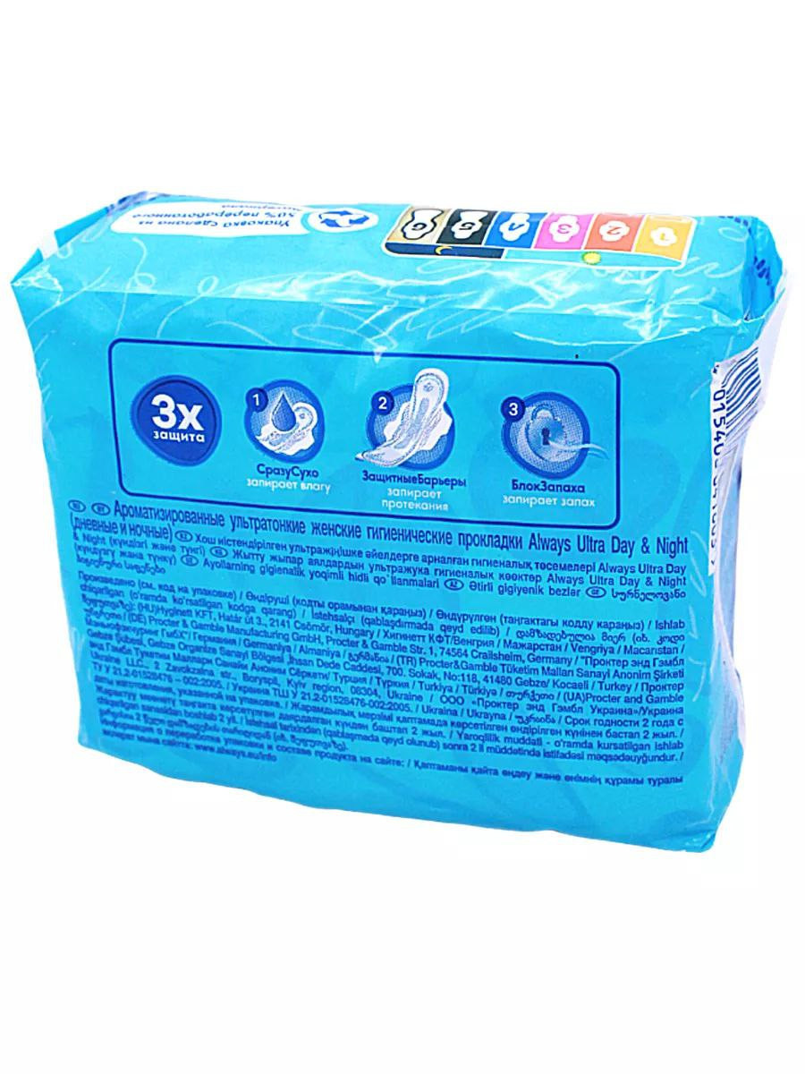 Always Ultra День и Ночь — это надёжные женские прокладки с усиленной защитой для дневного и ночного использования. Специальная технология 3x защиты обеспечивает мгновенную сухость, блокировку запаха и защиту от протеканий. Подходят для обильных выделений благодаря суперпоглощающему внутреннему гелю и высокой степени впитываемости (6 капель).