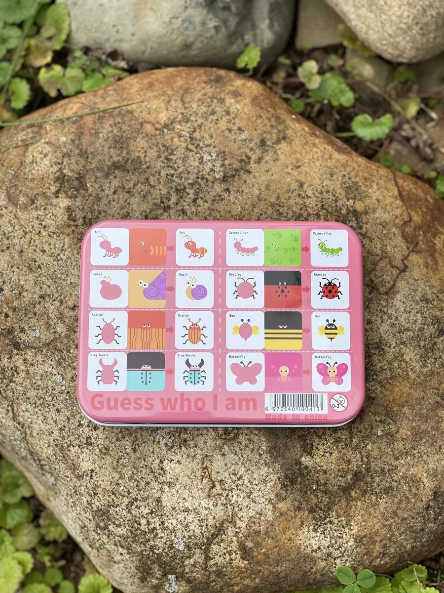 Развивающие карточки вкладыши для малышей на английском языке. Набор для занимательной игры представляет собой комплект из 8 пар карточек из плотного картона, которые можно хранить в металлической коробке. На одной из карточек нарисовано изображение, которое можно выдавить или вставить, в зависимости от задуманной игры. На другой карточке – рисунок без вкладыша. Все элементы не имеют острых и режущих углов, игра выполнена в мягких комфортных для малыша цветах. В процессе игры ребёнок развивает мелкую моторику, внимательность, зрительное и тактильное восприятие, усидчивость, использует логическое мышление, развивает способность находить нестандартные решения, творческий подход.