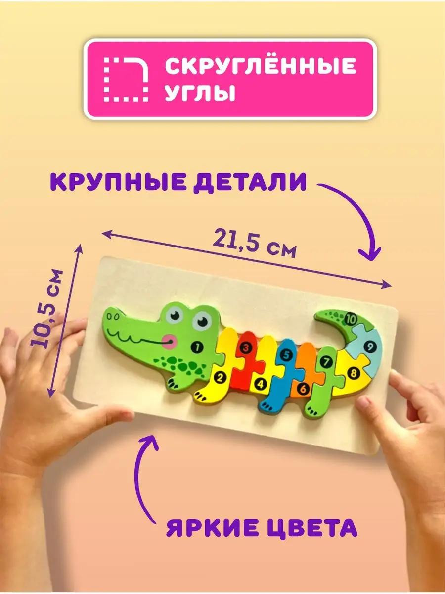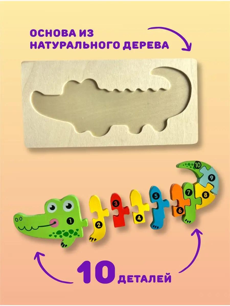 Обучающий пазл из дерева в виде крокодила — отличный выбор для раннего развития. Помогает ребенку учиться считать от 1 до 10 и различать цвета. Изготовлен из натурального дерева с безопасными закруглёнными краями.