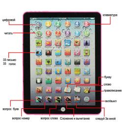 Поможет малышу в игровой форме изучить буквы и цифры, познакомиться с разными звуками, мелодиями и стихами, а также попробовать отвечать на загадки планшета, используя логику и сообразительность.Такой обучающий планшет с первых минут будет привлекать ребенка, так как он выполнен в достаточно реалистичном стиле и напоминает настоящее устройство.