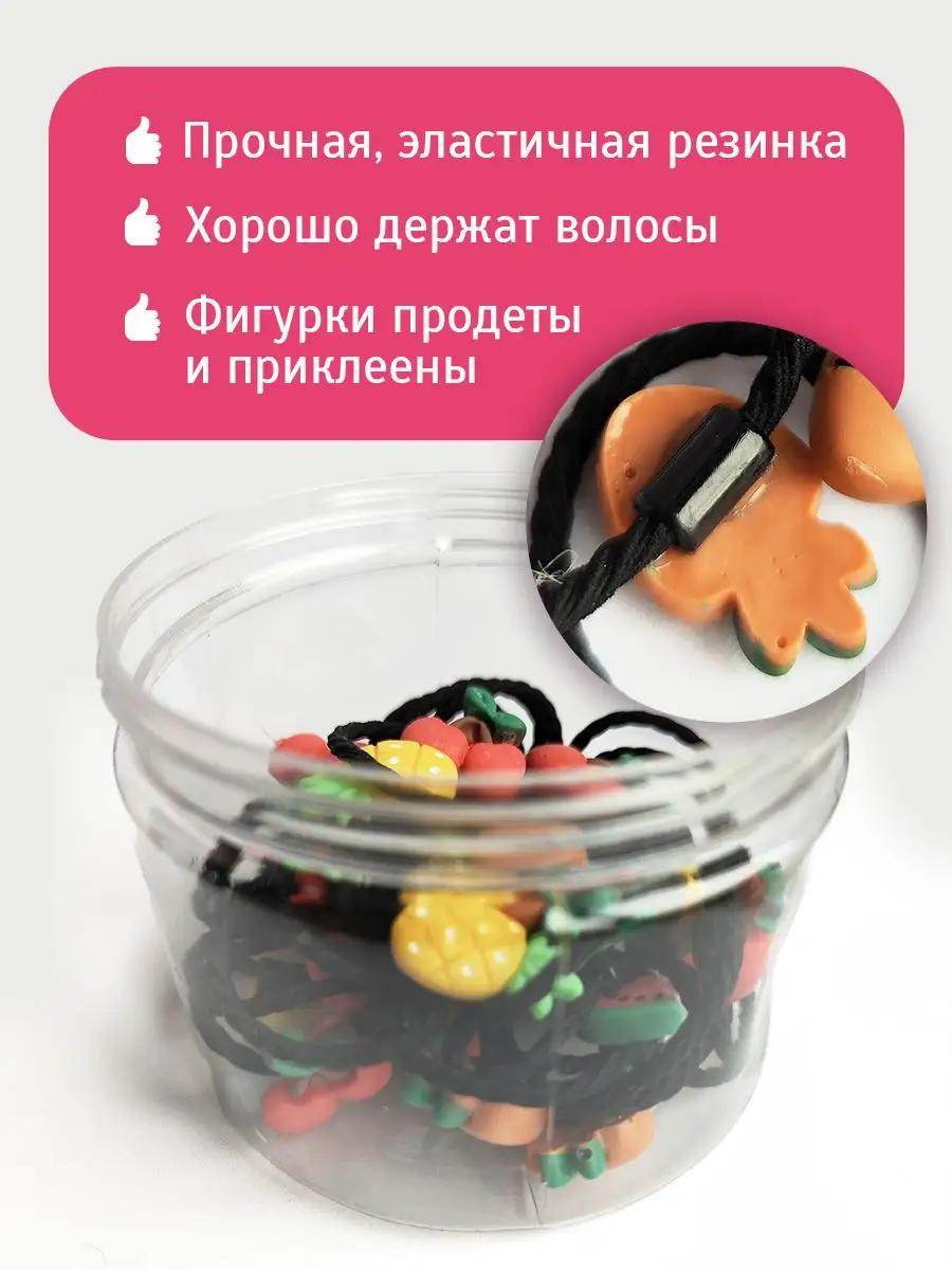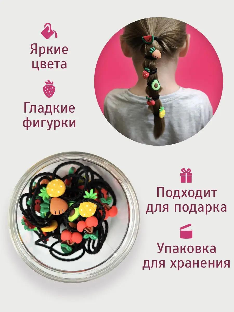 Яркий и оригинальный комплект резинок с декором в виде фруктов и овощей. Прочные, мягкие и безопасные для волос.