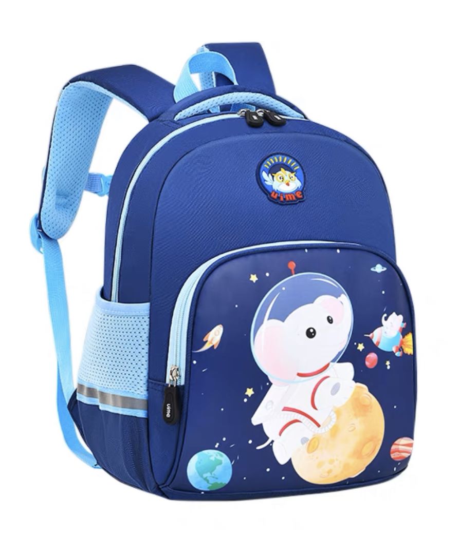 Отделения: Основное большое отделение для книг и игрушек, передний карман для мелочей и боковой карман для бутылок с водой или других нужных предметов.