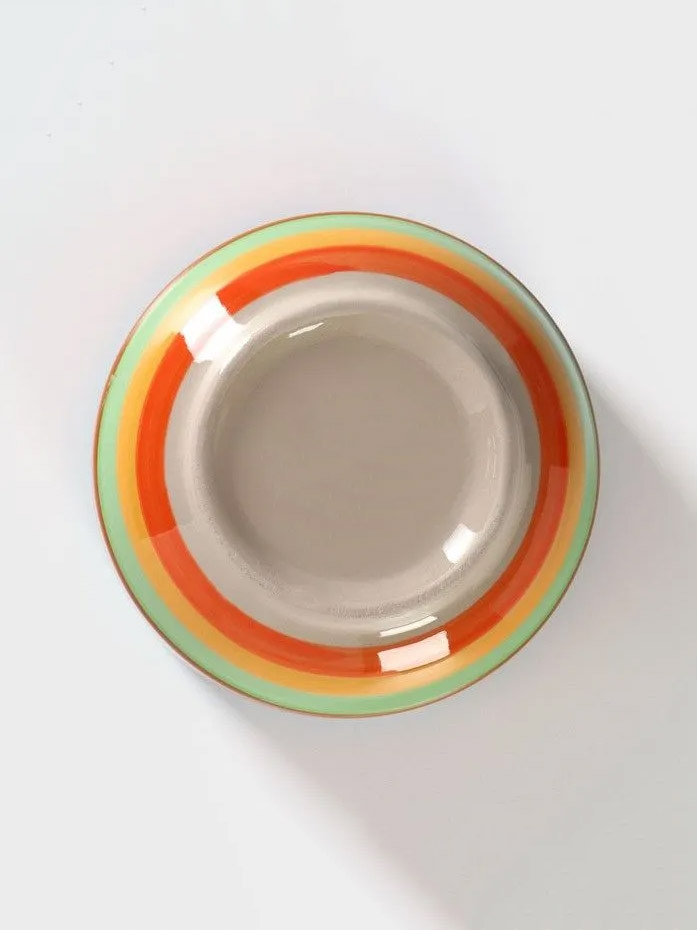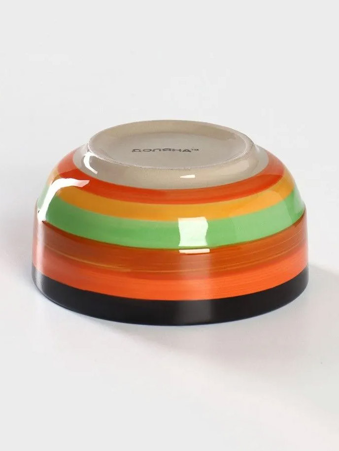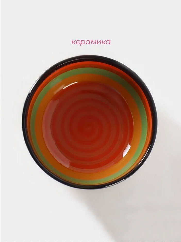 Яркая и стильная керамическая миска с красочным дизайном станет эффектным дополнением любого стола. Её насыщенные оранжевые, зелёные и жёлтые оттенки, плавно переходящие друг в друга, создают тёплую и уютную атмосферу. Глянцевая поверхность подчёркивает глубину цвета, а контрастный чёрный ободок придаёт посуде выразительность.
