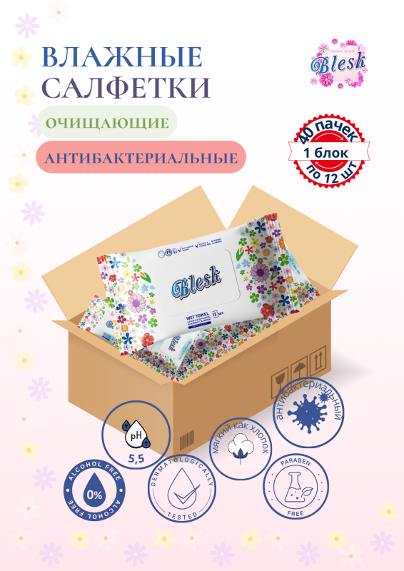 Антибактериальные влажные салфетки «BLESK» обеспечивают быструю и эффективную гигиеническую обработку рук и предметов. Изготовлены из мягкого нетканого материала и пропитаны специальным лосьоном, который уничтожает бактерии и помогает поддерживать чистоту в любое время и в любом месте. Идеально подходят для использования дома, на работе или в поездках.