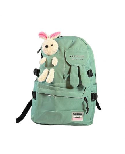 • Дизайн: На передней части рюкзака расположена мягкая игрушка в виде белого кролика с розовыми ушами, что добавляет оригинальности и привлекательности. Верхний карман украшен надписью "FASHION SUSTAINABLE", подчеркивающей экологическую ответственность бренда. На нижнем кармане видна нашивка с надписью "FASHIONMAG" и изображением флага.