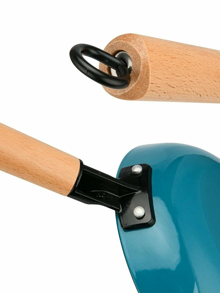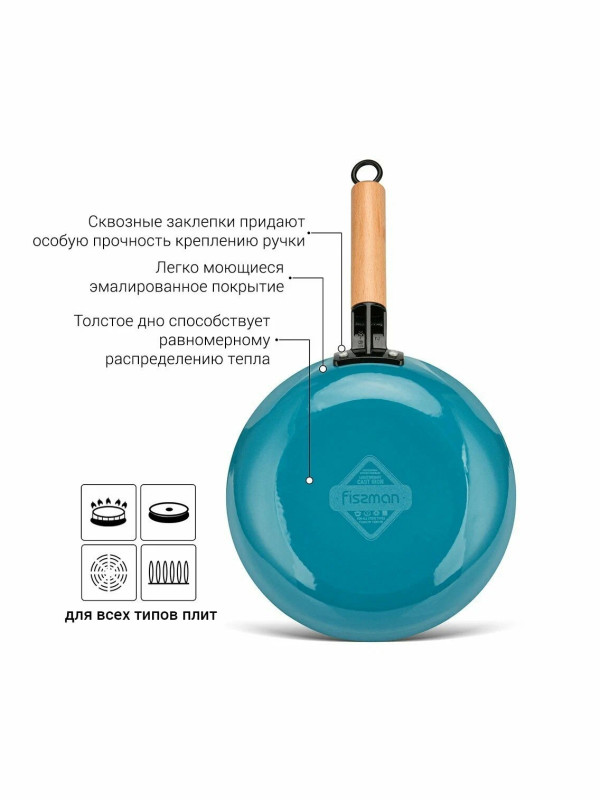 Эмалированное внешнее покрытие легко очищается, а стильная деревянная ручка с прочными заклёпками остаётся холодной при готовке и дополнена удобным кольцом для подвешивания.