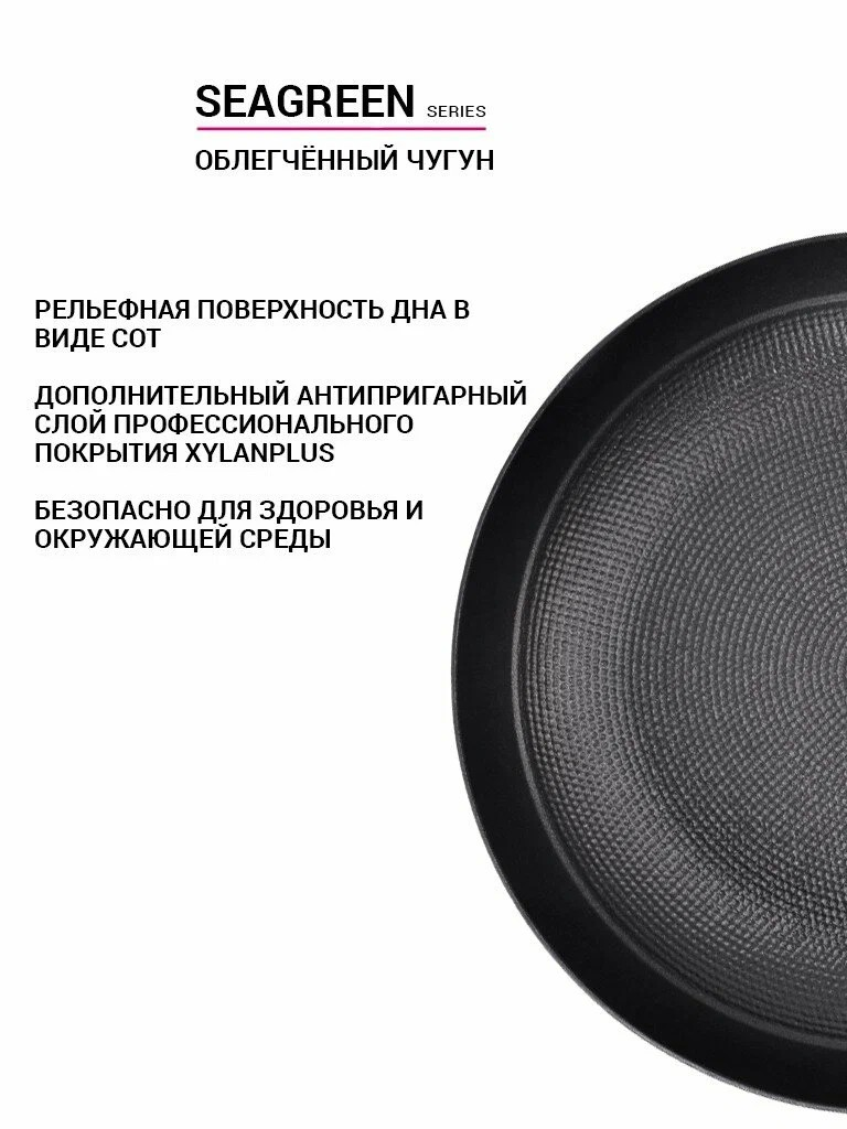 Сковорода FISSMAN Seagreen диаметром 24 см создана для комфортной и эффективной готовки. Изготовлена из облегчённого чугуна, она сочетает в себе прочность, долговечность и меньший вес, сохраняя при этом отличную теплоёмкость. Рельефное дно в виде сот и профессиональное антипригарное покрытие XYLANPLUS обеспечивают равномерное распределение тепла и предотвращают пригорание продуктов.