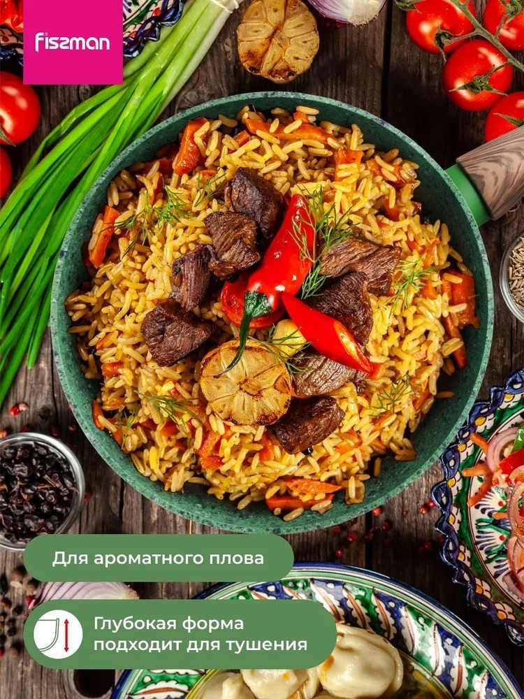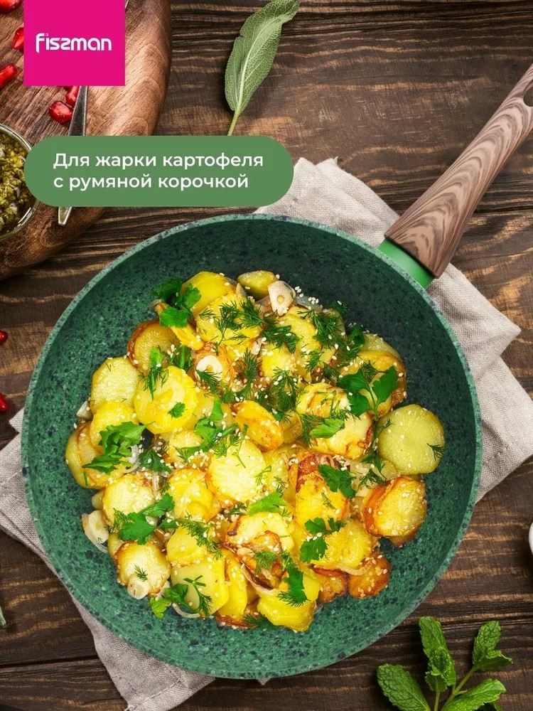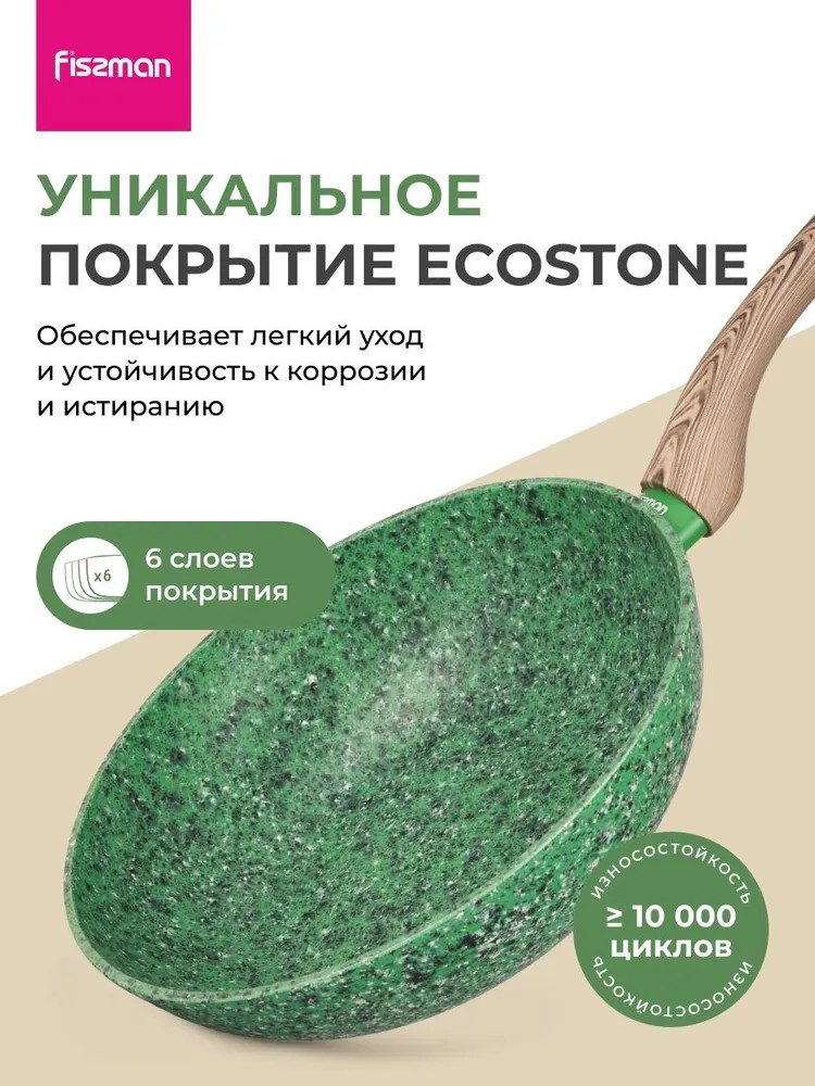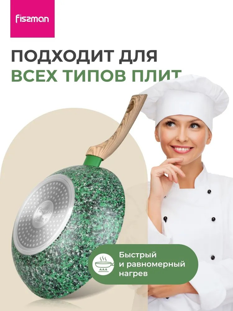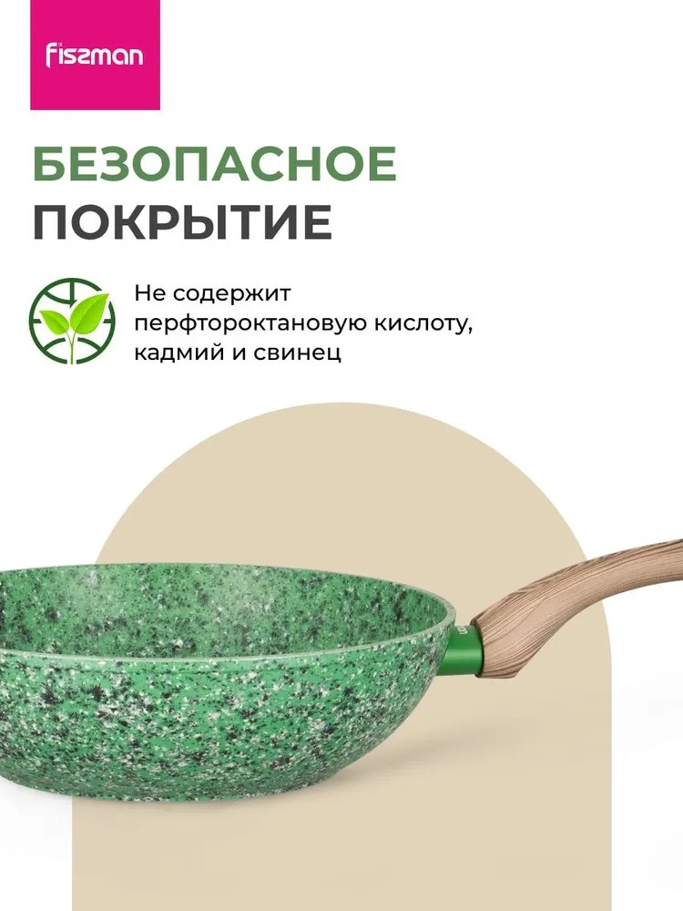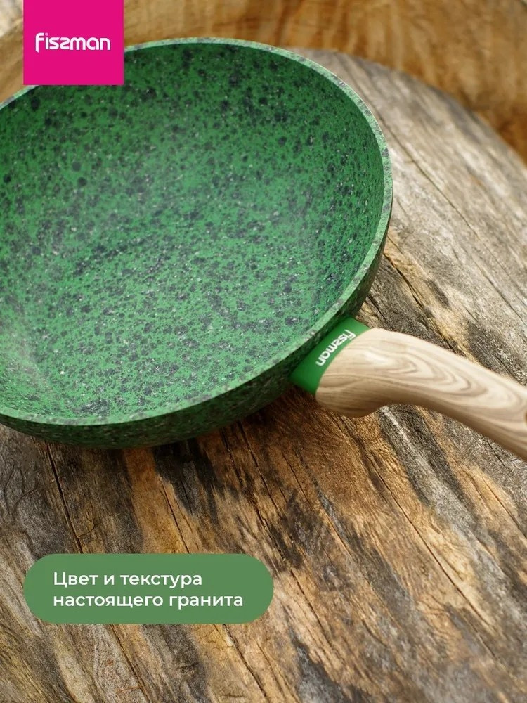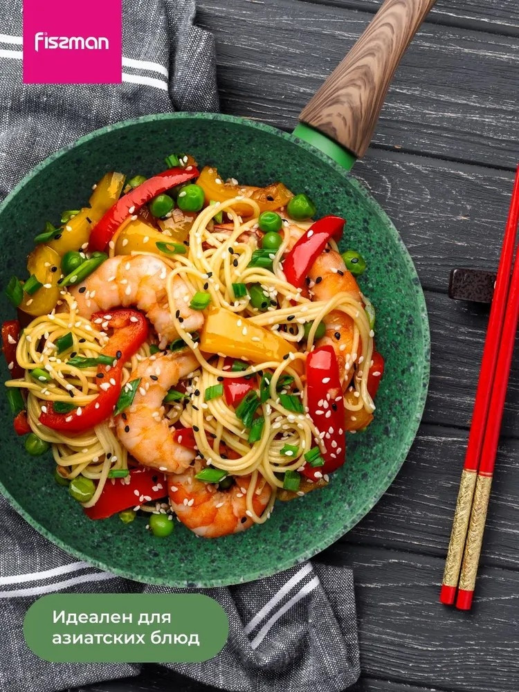 Сковорода вок Fissman Malachite — это сочетание функциональности, экологичности и уникального дизайна. Глубокая чаша идеальна для жарки, тушения и приготовления блюд азиатской кухни. Изготовлена из прочного литого алюминия с 6-слойным покрытием ECOSTONE, имитирующим натуральный зелёный гранит.