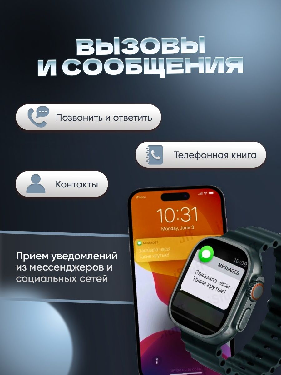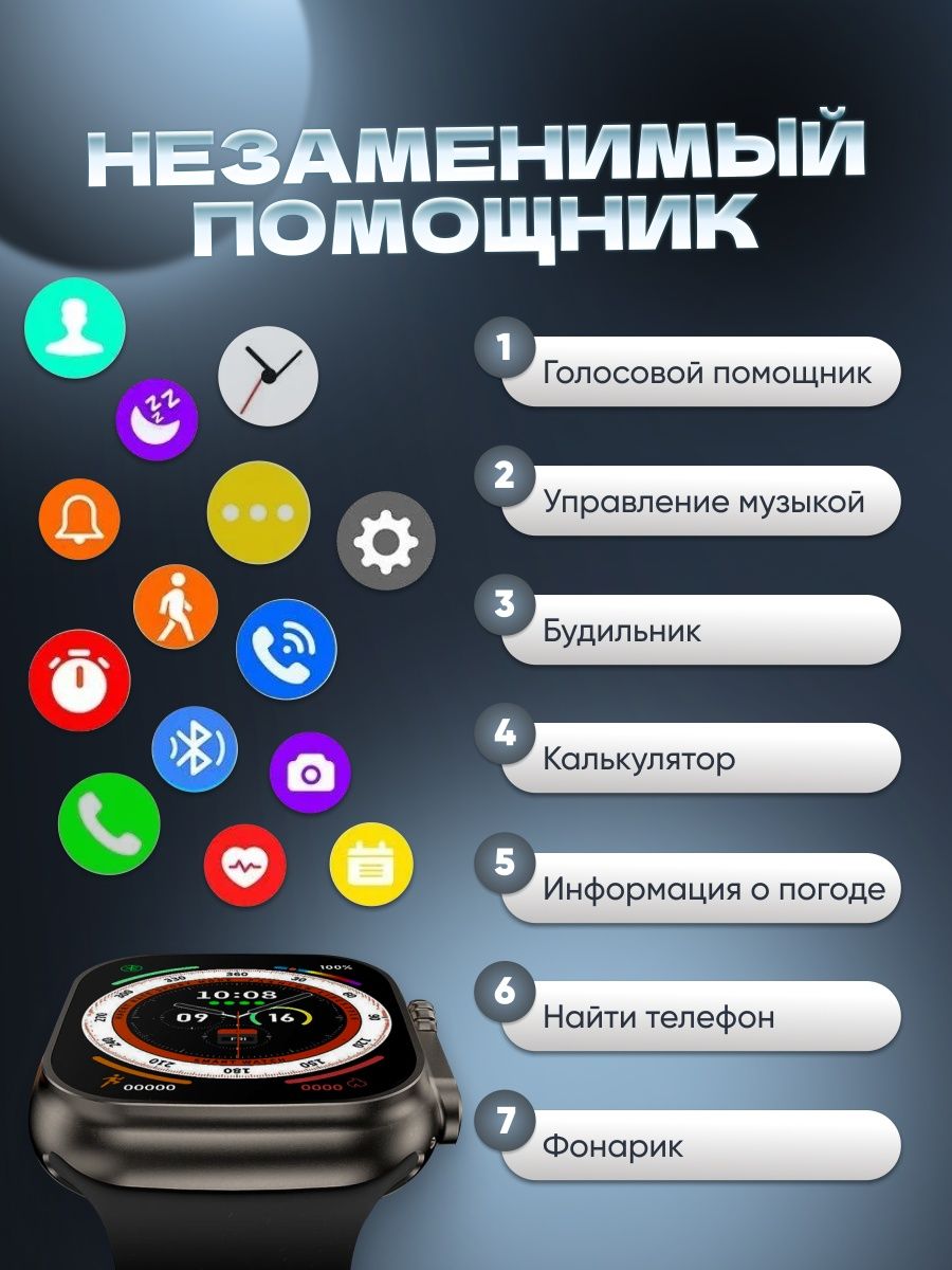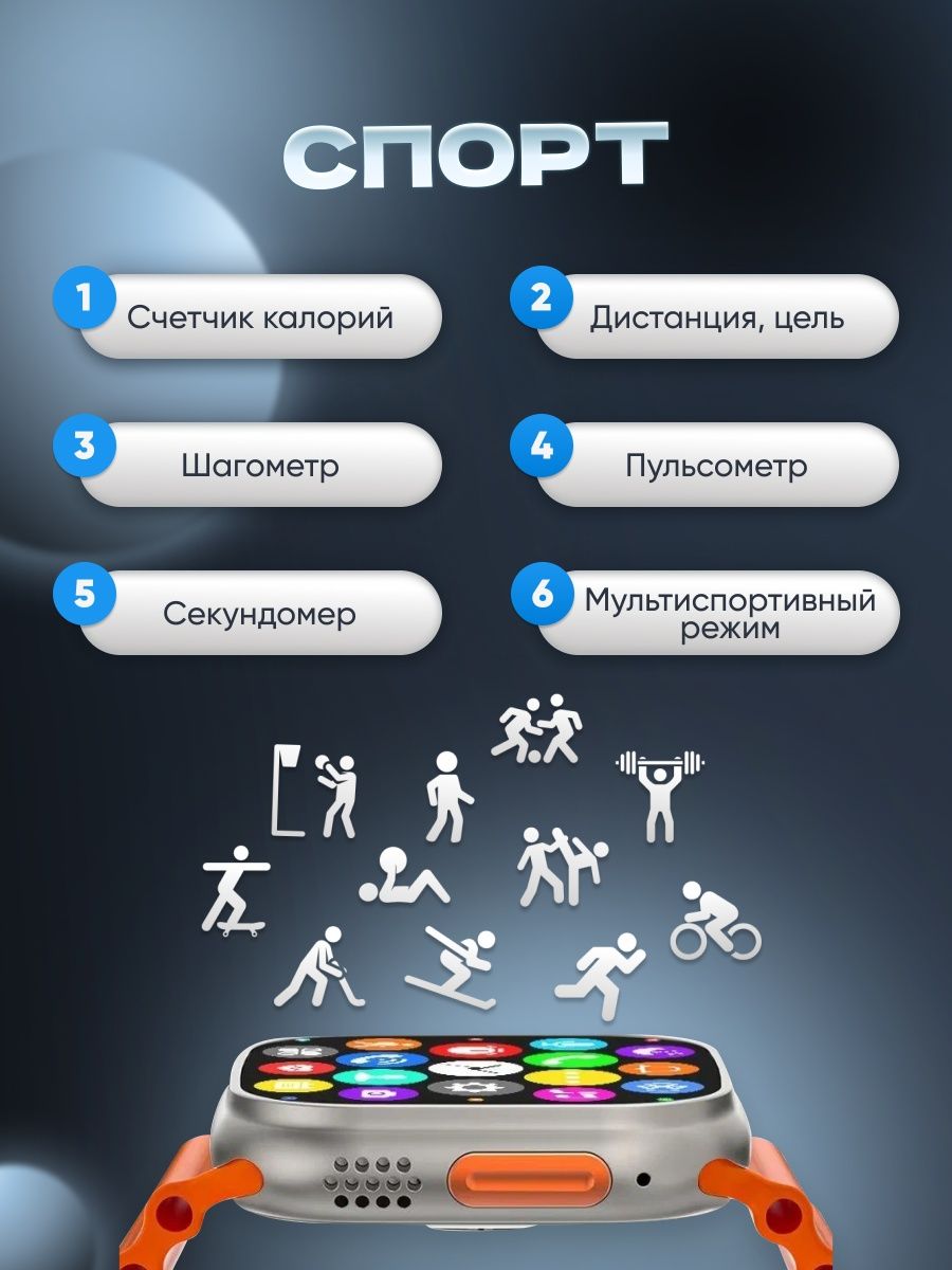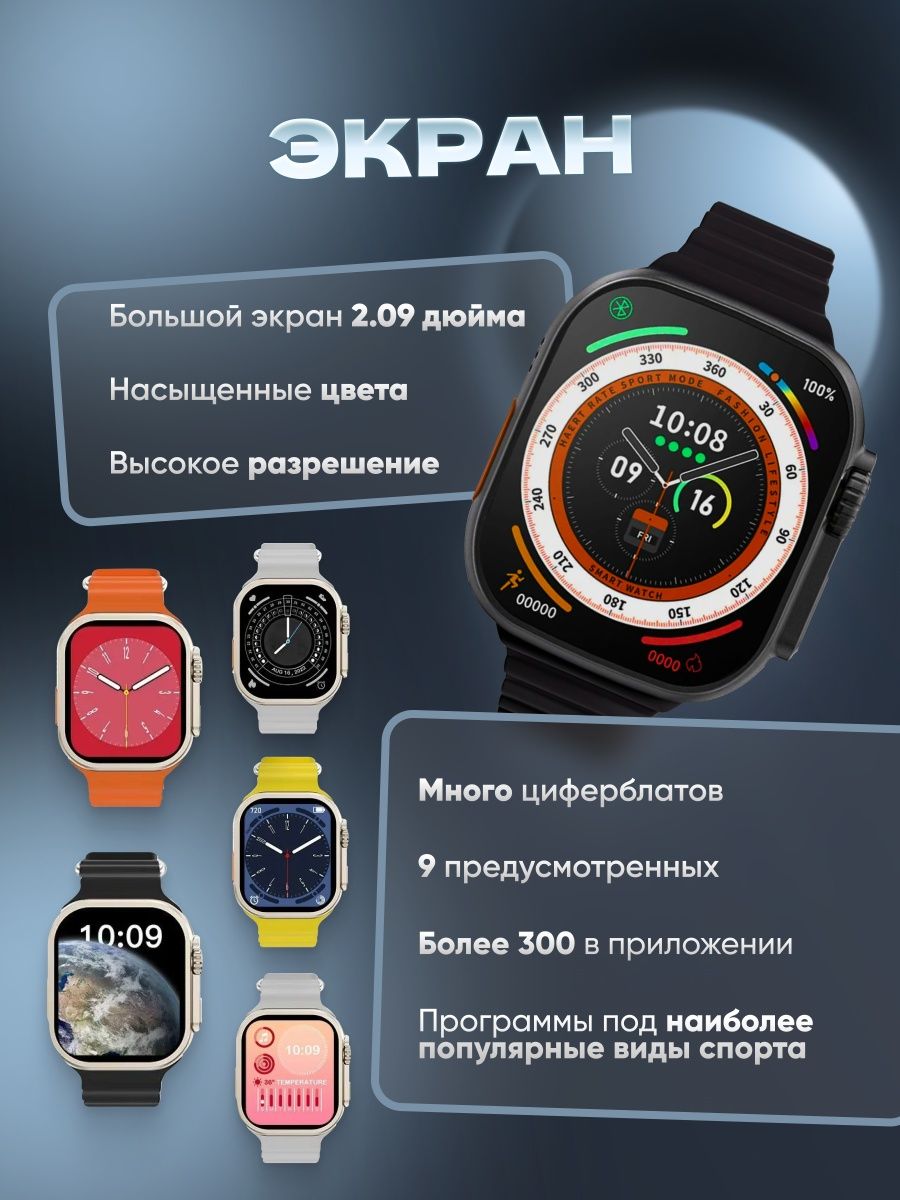 Смарт часы Т 900 ультра 2 биг это качественный аналог Watch Series 8 Ultra. Модель T 900 Ultra2 Big новинка 2024 года. Корпус часов, в современном техно стиле, повышенной прочности, изготовлен из алюминиевого сплава, экран, увеличенного до 2,09" размера, закрыт минеральным стеклом. Умные часы отлично работают с операционными системами Android, IOS, подключаясь по Bluetooth. Большой информативный дисплей облегчает считывание информации, повышает удобство пользование меню. Часы с калькулятором, нужны школьникам и взрослым в повседневной жизни. Достаточно большой корпус часов спроектирован таким образом, что с любым типом браслетов отлично обхватывает запястье. То есть и на женской и на детской руке большие смарт часы актуальны. Смарт часы- незаменимый помощник. Они облегчают прием телефонных звонков, уведомлений из социальных сетей и мессенджеров. Часы оснащены сенсорным дисплеем, при активации датчика движения появляется индикация времени. Доступно более ста циферблатов. Умные часы ультра идеальны как спортивный фитнес браслет. В них встроено несколько программ для различных видов тренировок на улице, дома, в спортзале. Помогают следить за здоровьем, покажут частоту пульса, артериальное давление, содержание кислорода в крови. Смарт часы не являются точным медицинским прибором, но позволяют следить за изменением показателей. Часы водонепроницаемые, заявлена степень защиты IP 67, что позволяет не переживать из-за кратковременного попадания в воду, но не предназначены для плавания. Smart Watch T 900 Ultra Big- незаменимый помощник в жизни. Оснащены будильником, калькулятором, календарем. Смарт часы помогают управлять музыкой. При этом держать в руках смартфон совсем необязательно. Управление музыкой есть в умных часах, а они всегда на руке. Инструкция на русском языке в информационных карточках. Подходят взрослым, подросткам, детям. Понравятся всем.