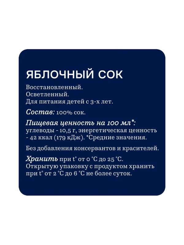 100% восстановленный осветлённый яблочный сок без добавления сахара, консервантов и красителей. Отлично подходит для ежедневного употребления и питания детей с 3 лет.