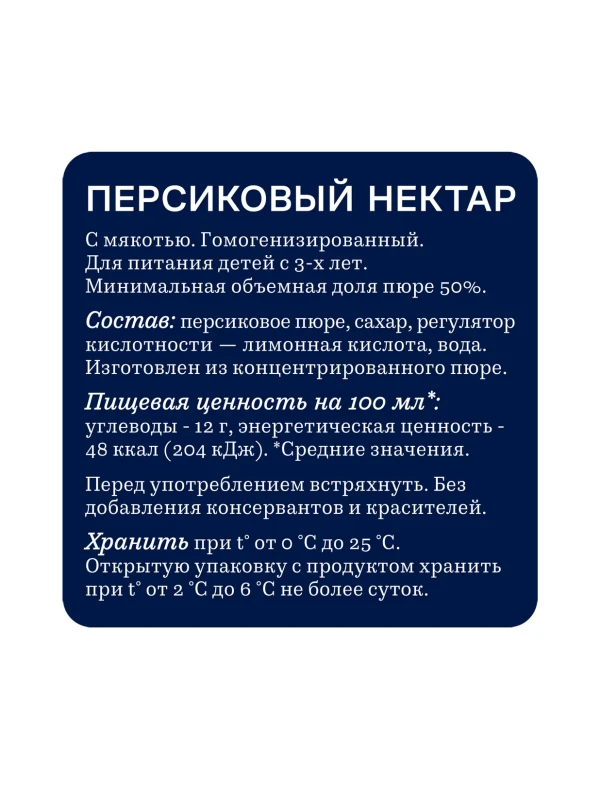Минимальная объемная доля пюре — не менее 50%, что делает нектар особенно насыщенным. Подходит для детского питания с 3-летнего возраста.