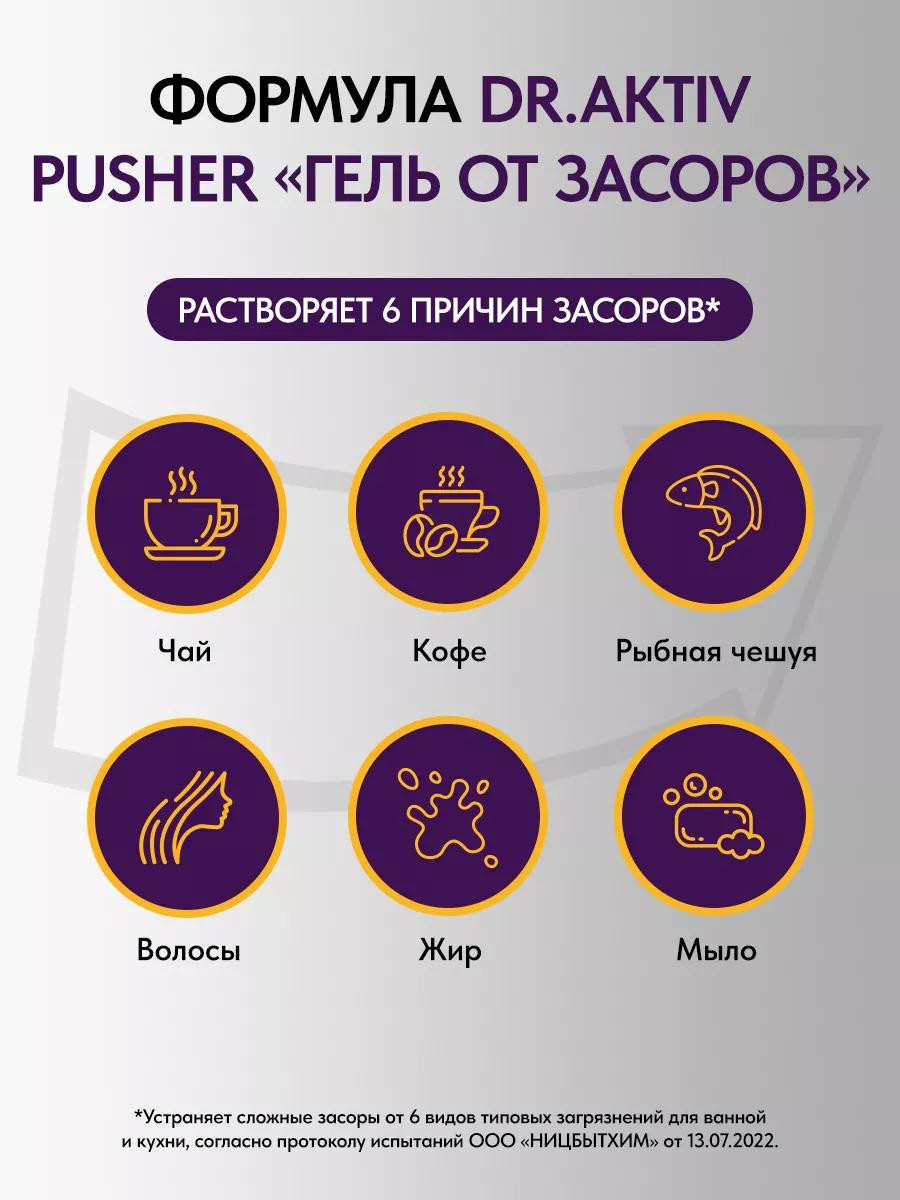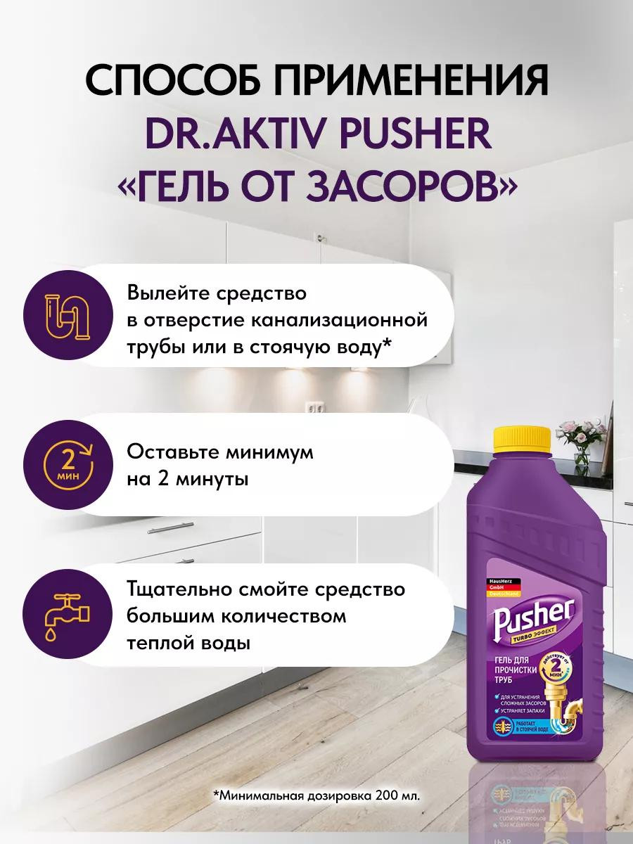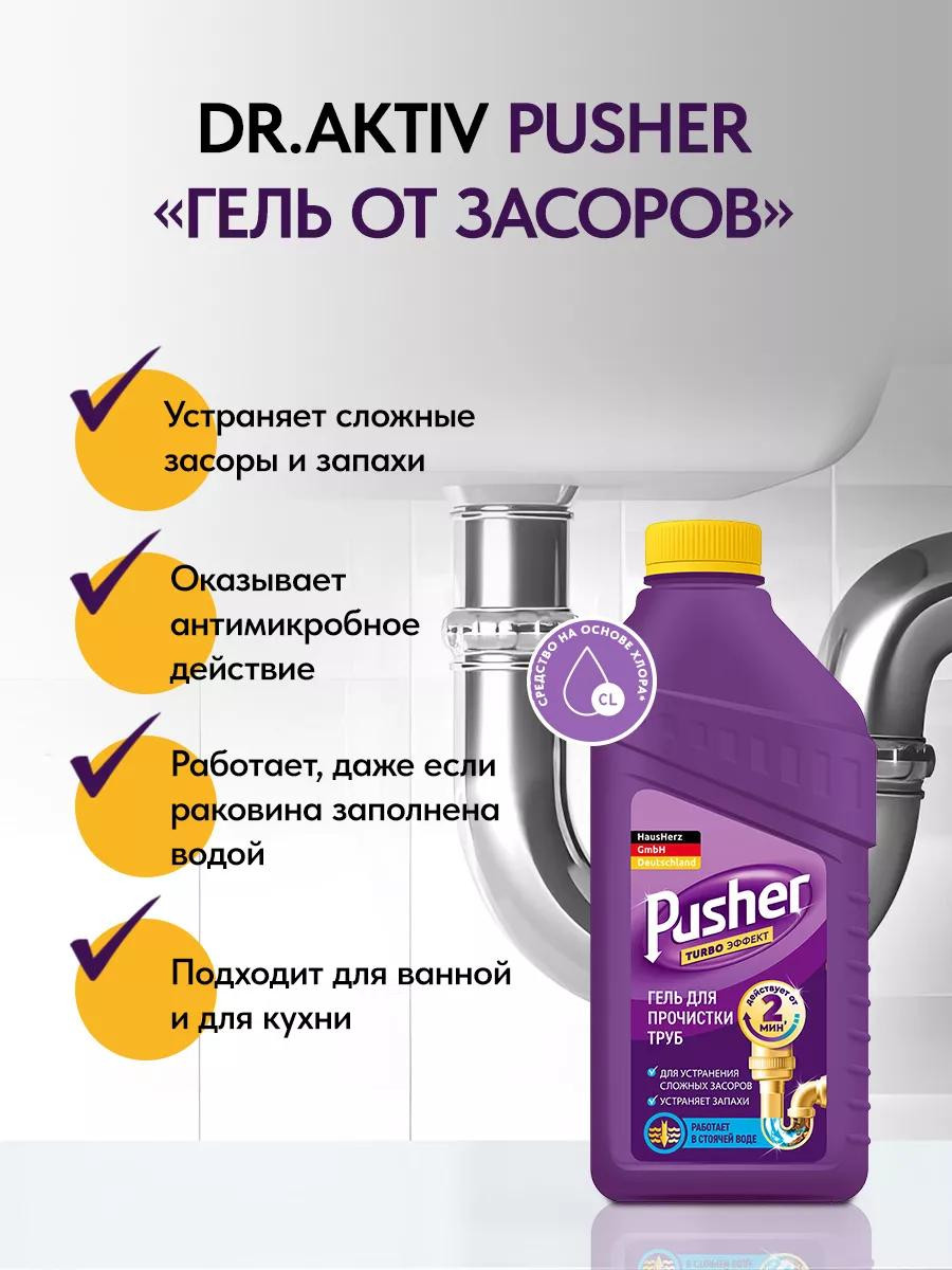 Одним из главных преимуществ PUSHER является его способность работать даже при наличии воды в раковине. Вы больше не будете испытывать неудобство при попытке прочистить засоры, когда ванна или раковина уже заполнены водой. Жидкая форма значительно облегчает и упрощает процесс использования, достаточно всего лишь налить средство прямо в слив и дать ему сделать свою работу. Продукт справится с различными типами засоров сантехники, он с легкостью устраняет жир, волосы, шерсть животных и остатки пищи.