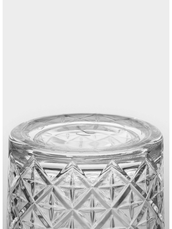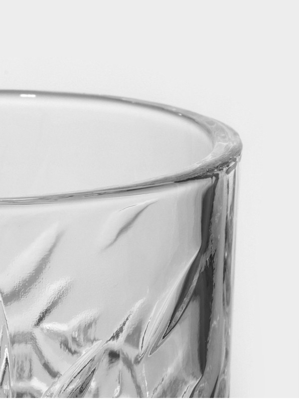 - Материал: Высококачественное прозрачное стекло с характерным рельефным узором, имитирующим огранку хрусталя. Этот дизайн не только придает стакану роскошный вид, но и делает его удобным для захвата.