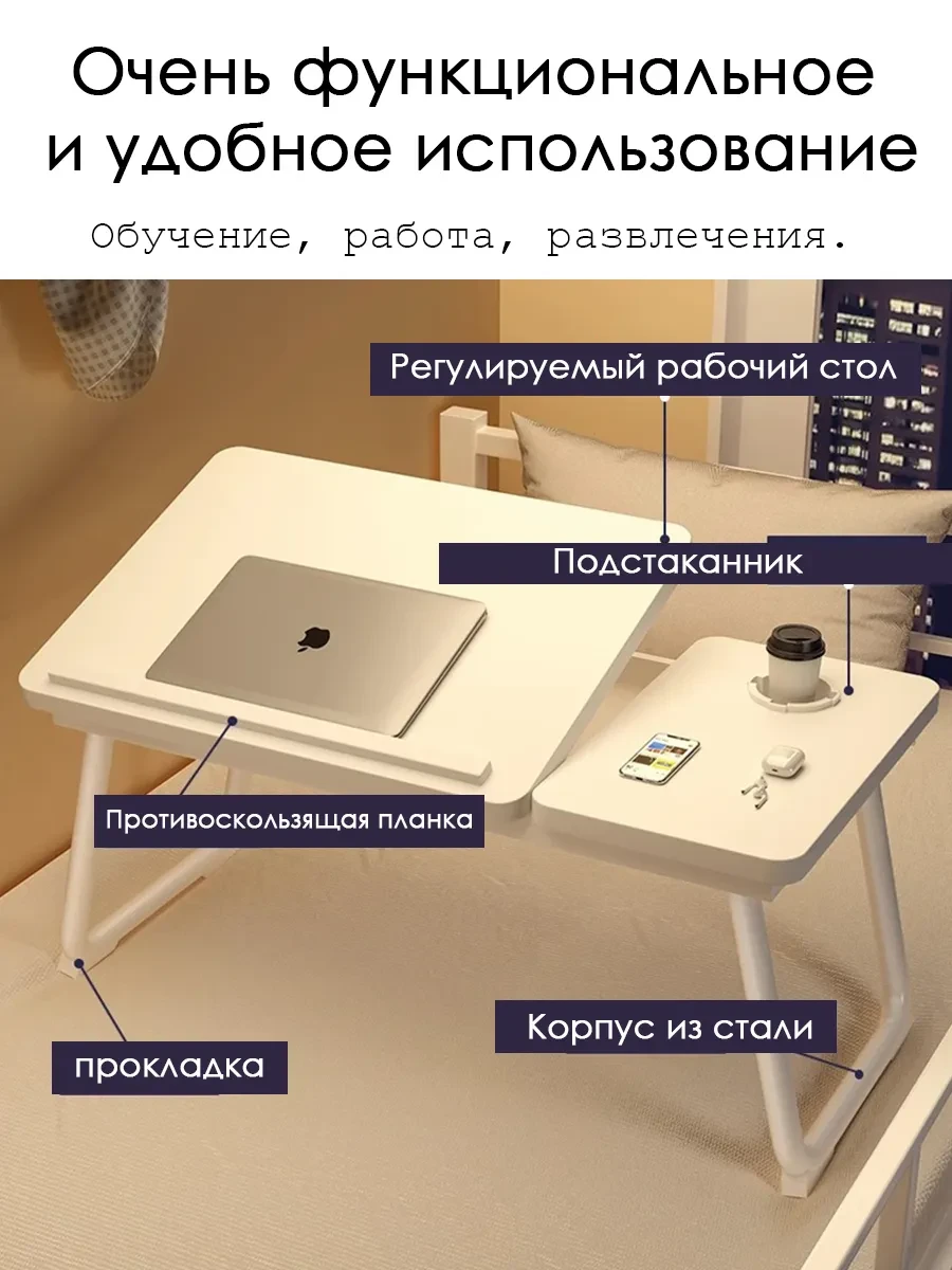 Мини столик в постель — это идеальное решение для работы с ноутбуком или завтрака в постели. Он удобно поддерживает Ваше устройство, позволяя Вам комфортно сидеть или лежать, не переживая о том, что ноутбук может упасть или перегреться. Этот столик легок и подвижен, его можно быстро перемещать по комнате, что делает его универсальным помощником для учебы, чтения или выполнения домашних заданий. Его стильный и компактный дизайн делает его не только практичным, но и эстетичным дополнением к Вашему интерьеру. Теперь Вы можете наслаждаться удобством работы или еды, не вставая с кровати!