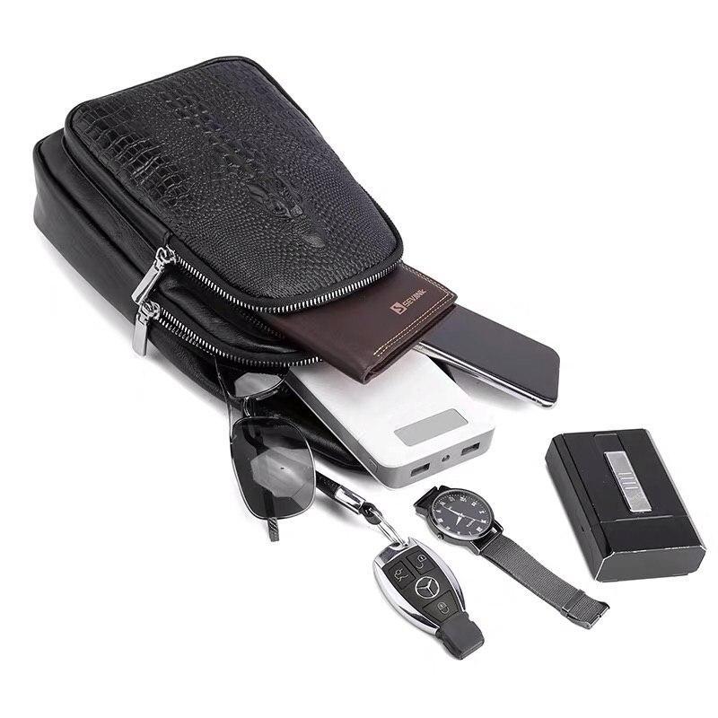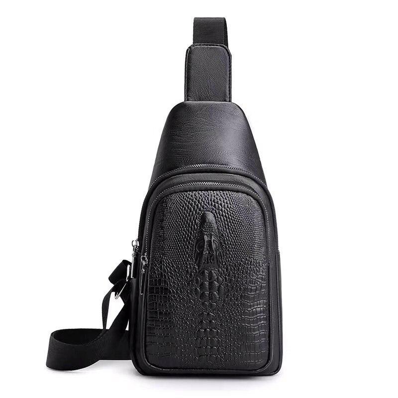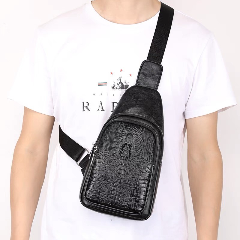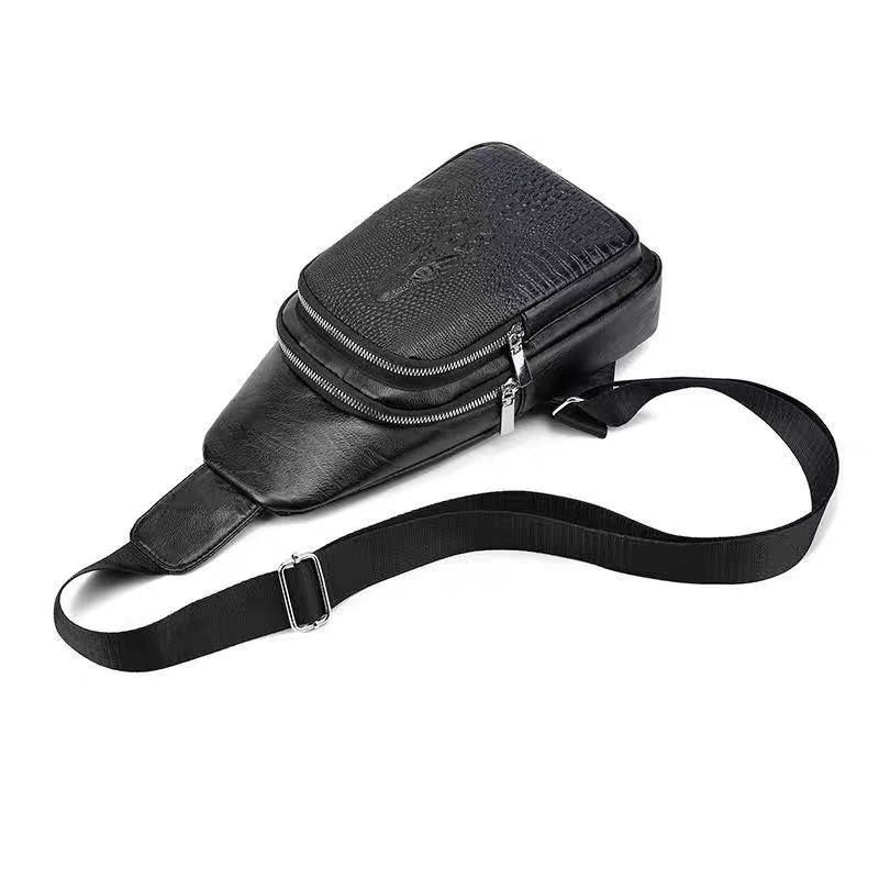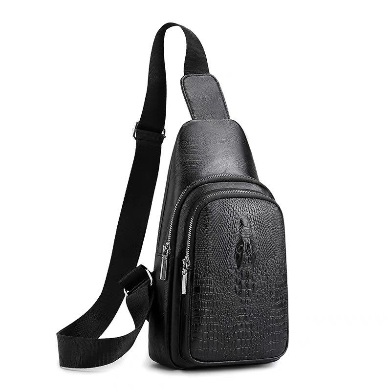 Эта стильная черная сумка через плечо с текстурой под крокодила на переднем кармане отличается современным дизайном и функциональностью.