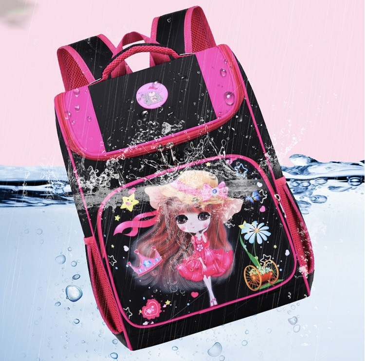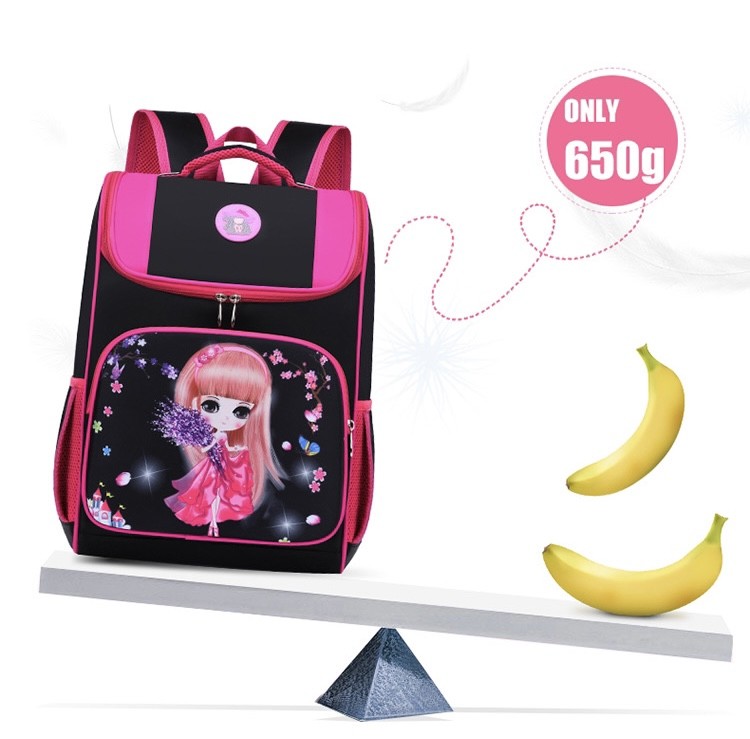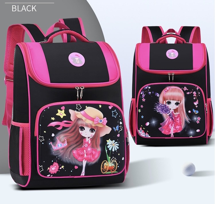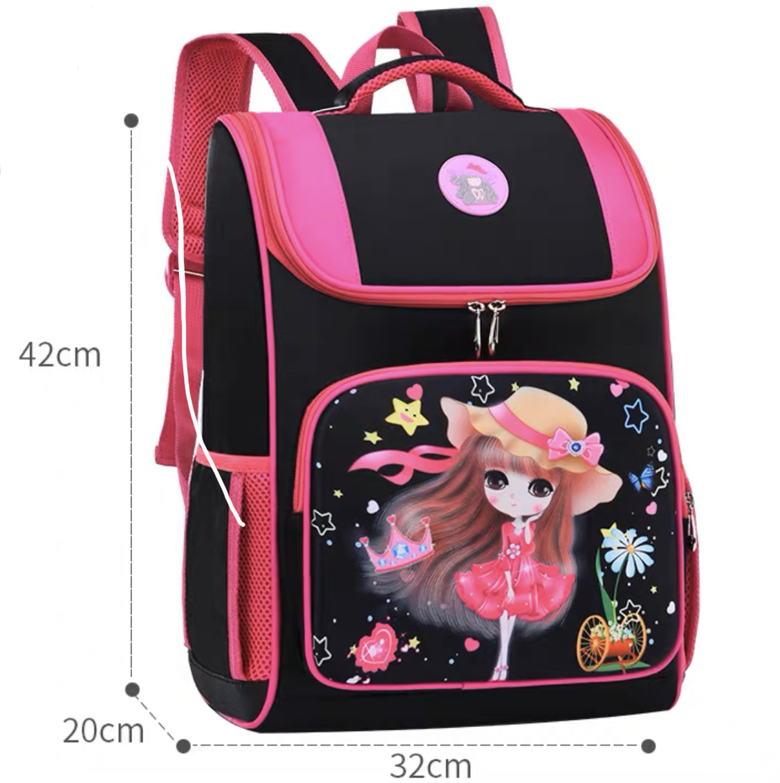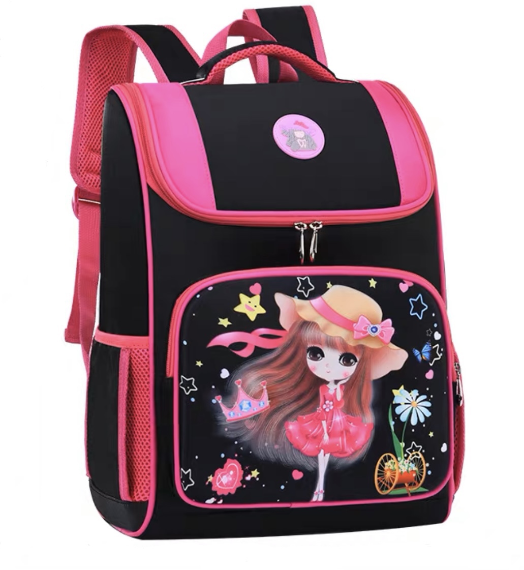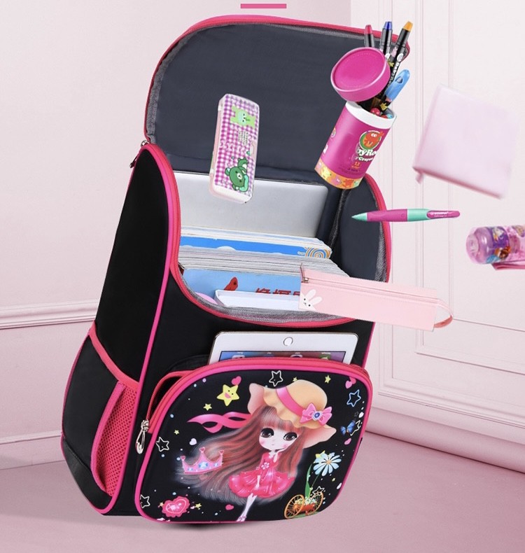 Дизайн: Рюкзак украшен изображением девочки в розовом платье и жёлтой шляпе с розовой лентой. Фон дизайна включает звёзды, цветы и другие декоративные элементы. Рюкзак имеет розовые лямки и ручку, а также круглый эмблему на верхней крышке.