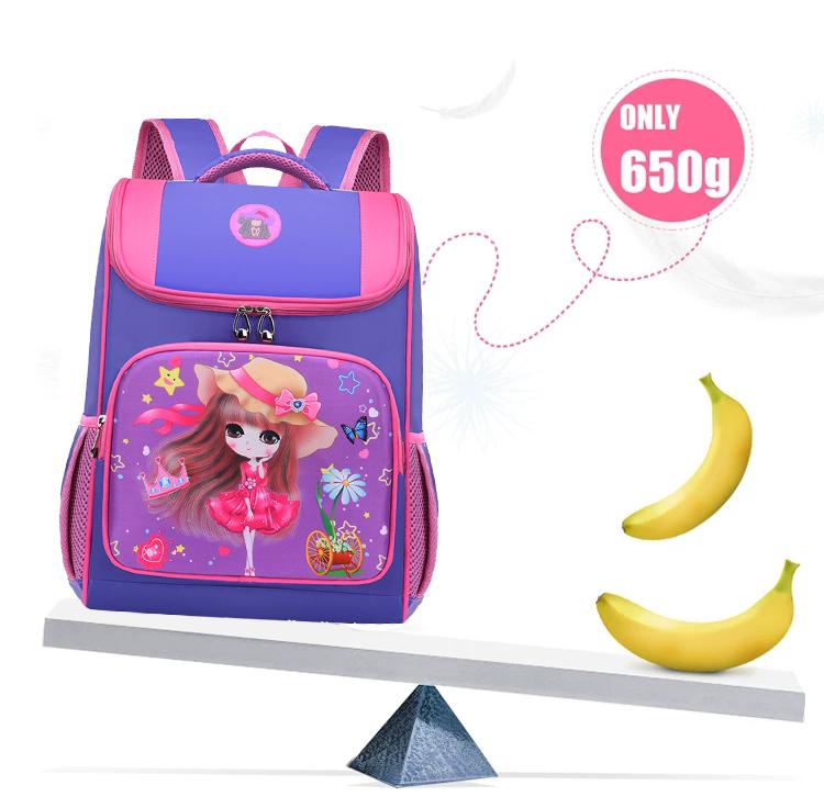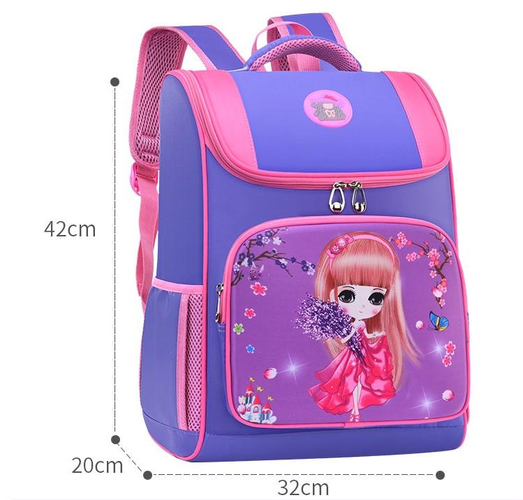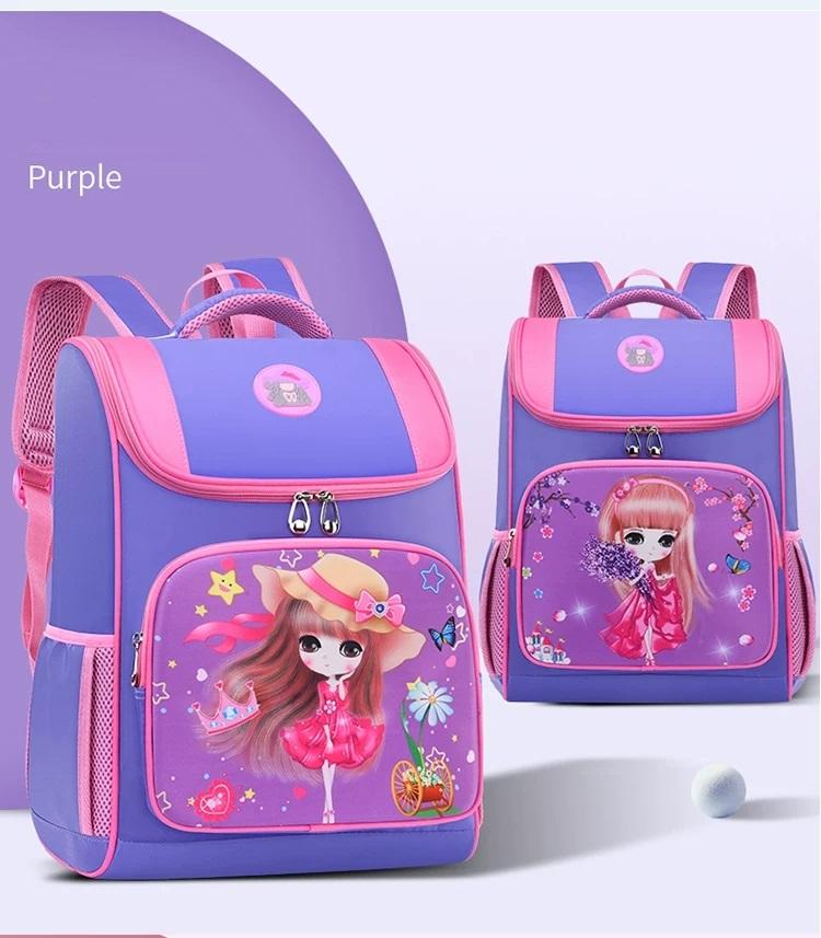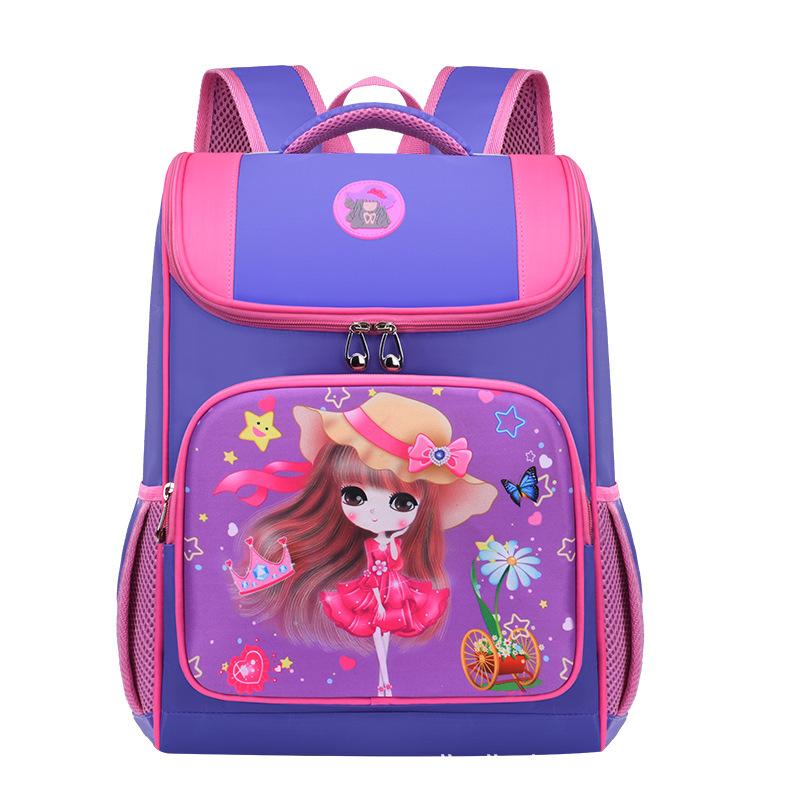 Дизайн: Рюкзак украшен изображением девочки в розовом платье и жёлтой шляпе, окружённой звёздами, бабочкой, цветком и маленькой каретой. Основной цвет рюкзака - фиолетовый с розовыми акцентами.