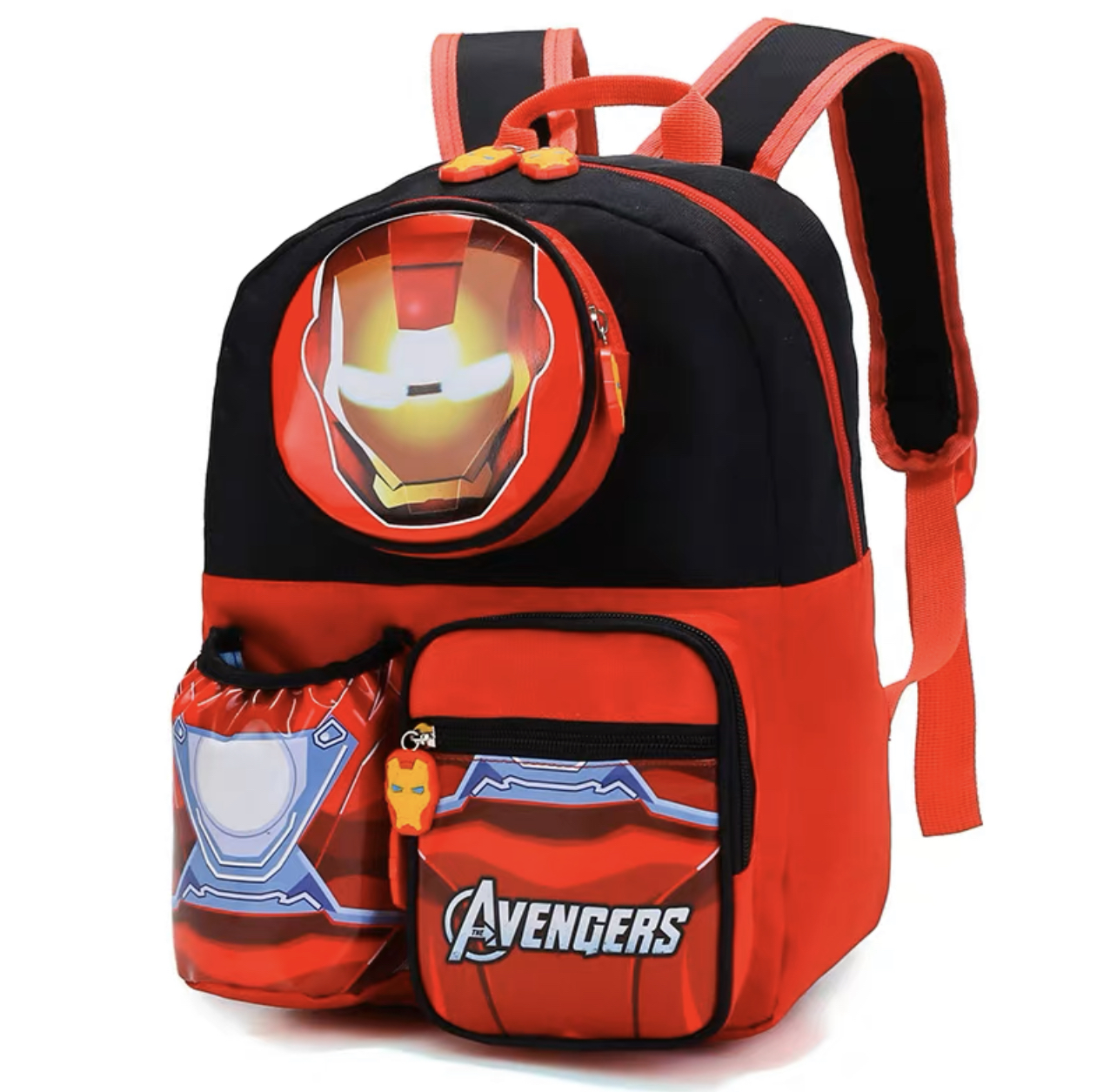 Дизайн: Рюкзак выполнен в тематике Мстителей, с изображением Железного Человека на верхнем отделении и логотипом Мстителей на переднем кармане. Боковой карман украшен изображением, напоминающим реактор Железного Человека.