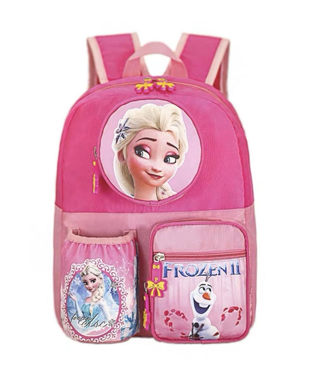 - **Дизайн**: На передней части рюкзака изображены персонажи из "Холодное сердце II", включая Олафа, с надписью "FROZEN II" над ним. Боковой карман также украшен изображением одного из персонажей мультфильма.