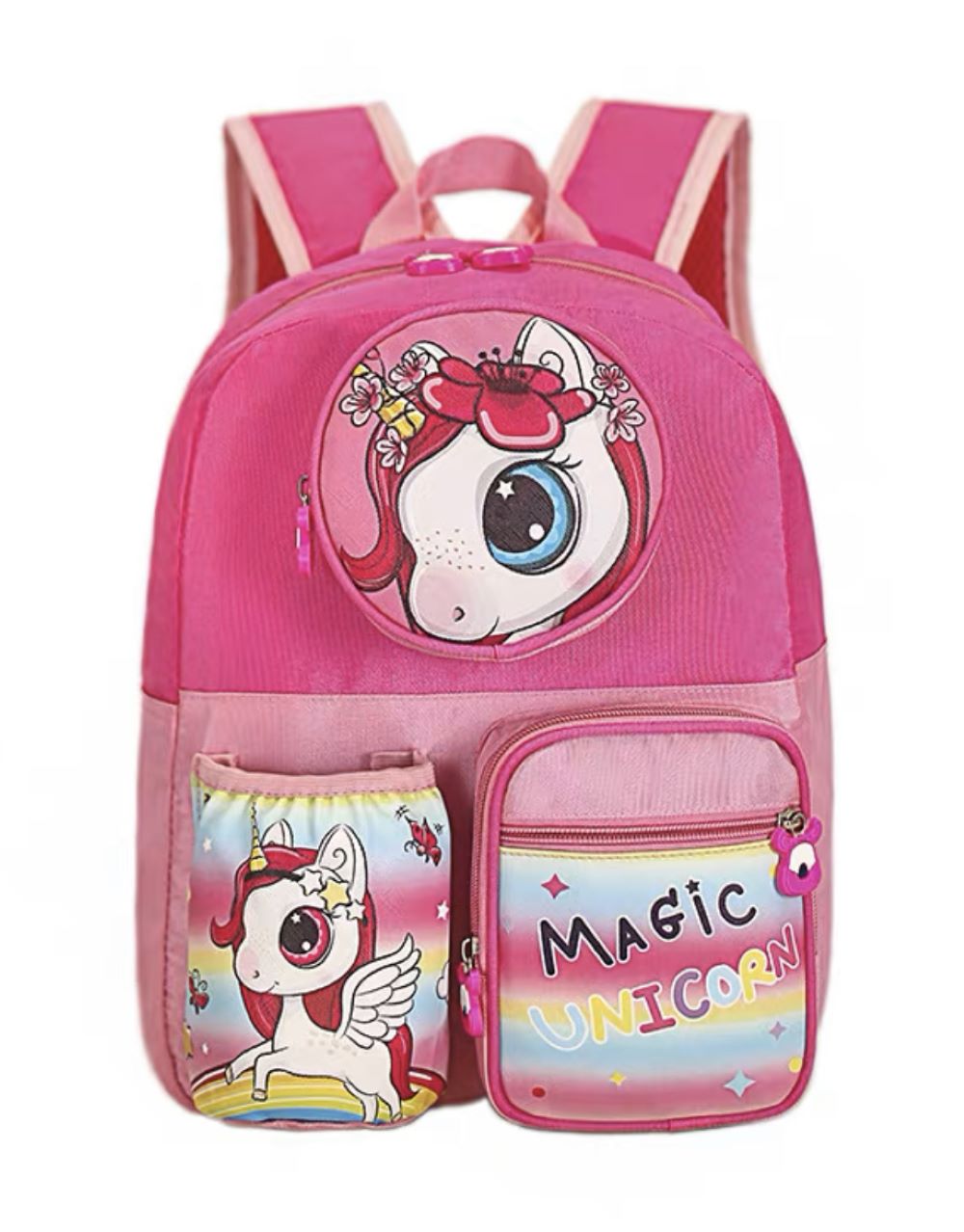 Этот очаровательный рюкзак выполнен в ярко-розовом цвете и украшен изображением единорога, что делает его идеальным для маленьких любителей волшебных существ.