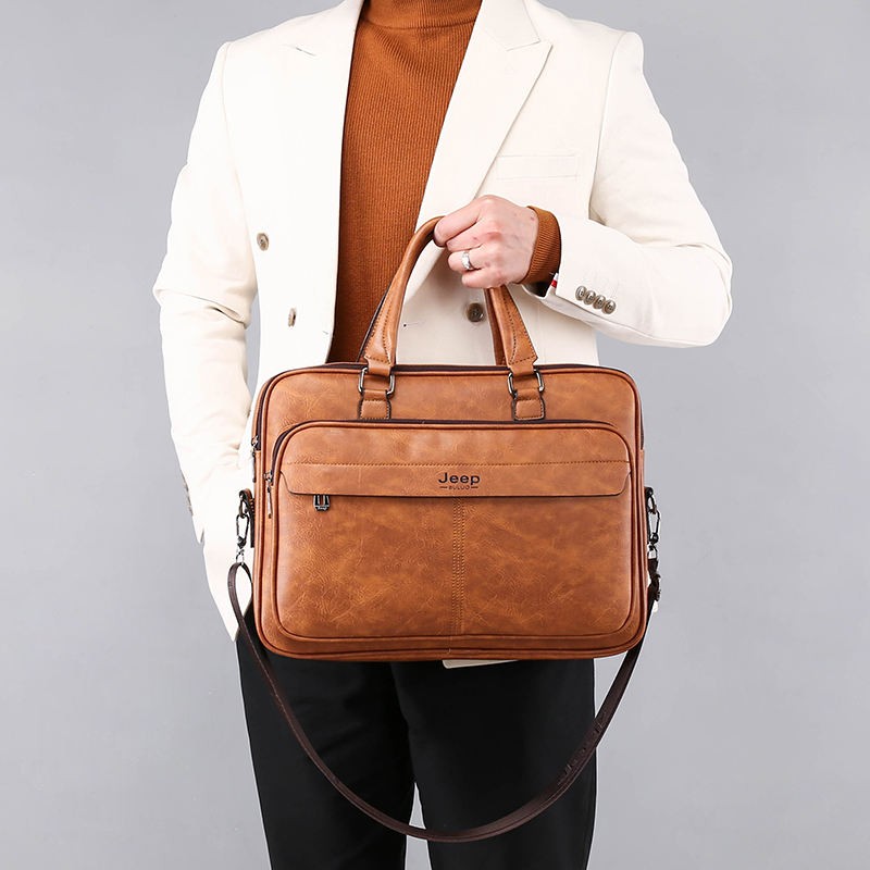 Эта стильная коричневая кожаная сумка с двумя ручками и съемным плечевым ремнем от бренда "Jeep" идеально подходит для профессионального использования и повседневных нужд.