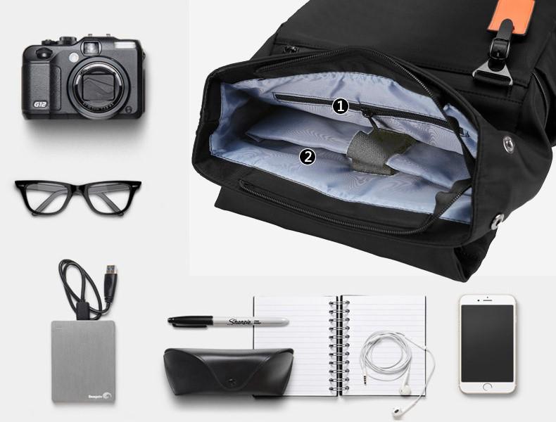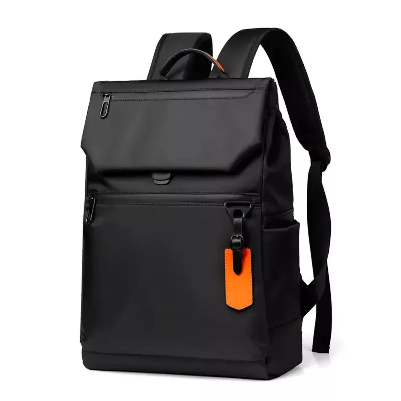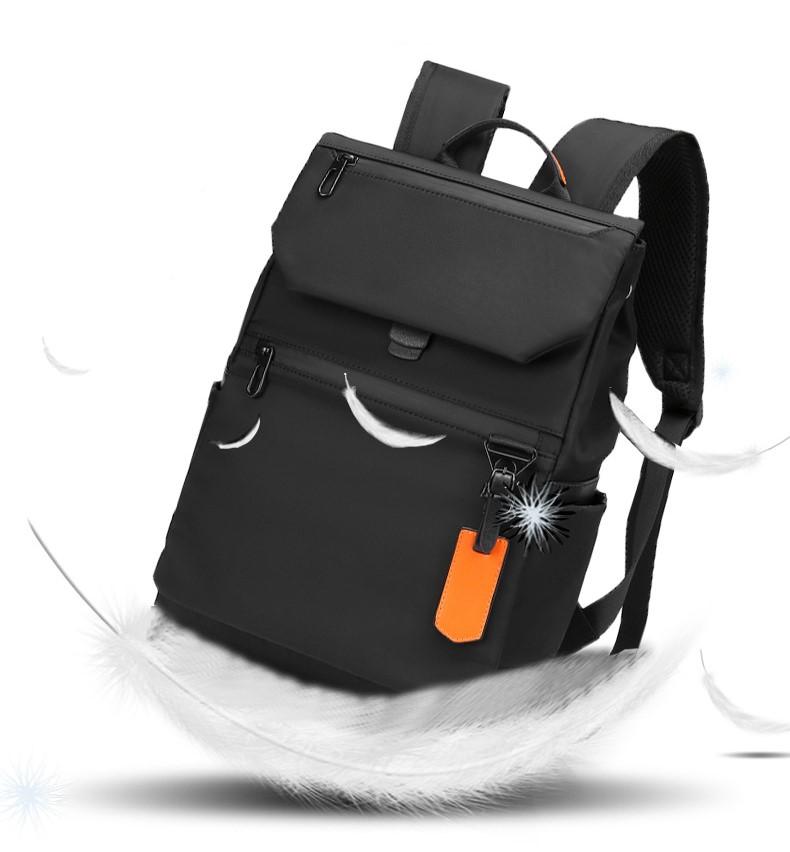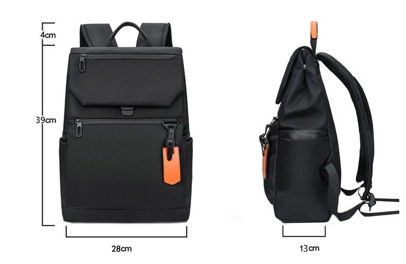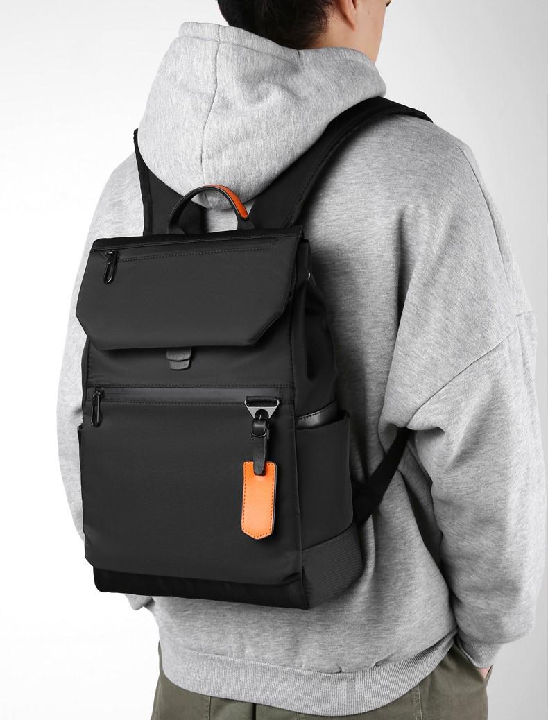 Дизайн: Рюкзак имеет верхний клапан с карманом на молнии, передний карман с молнией и застежкой, а также яркий оранжевый ярлык на передней части, который добавляет стильный акцент. Плечевые ремни мягкие для комфорта, а также есть боковые карманы с обеих сторон для дополнительных вещей.